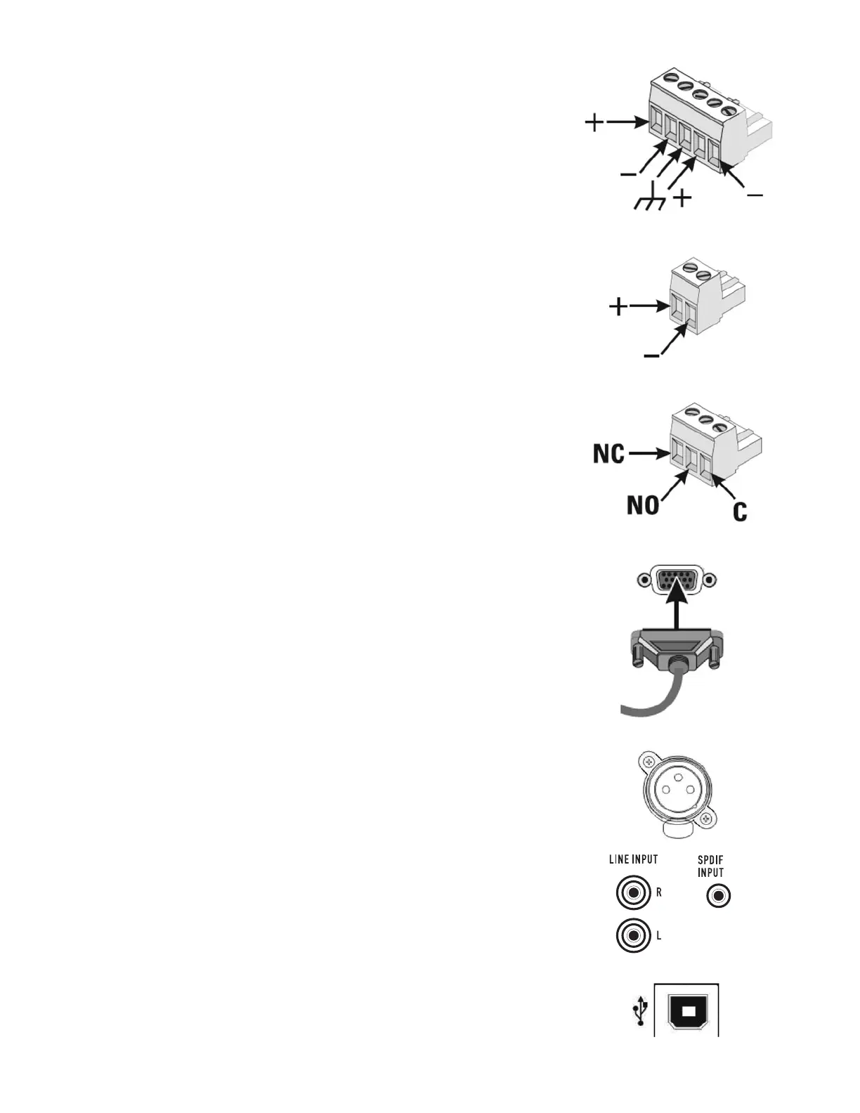 balanced impedance source. All connections require a 2-terminal or 6-terminal Euro style plug. The