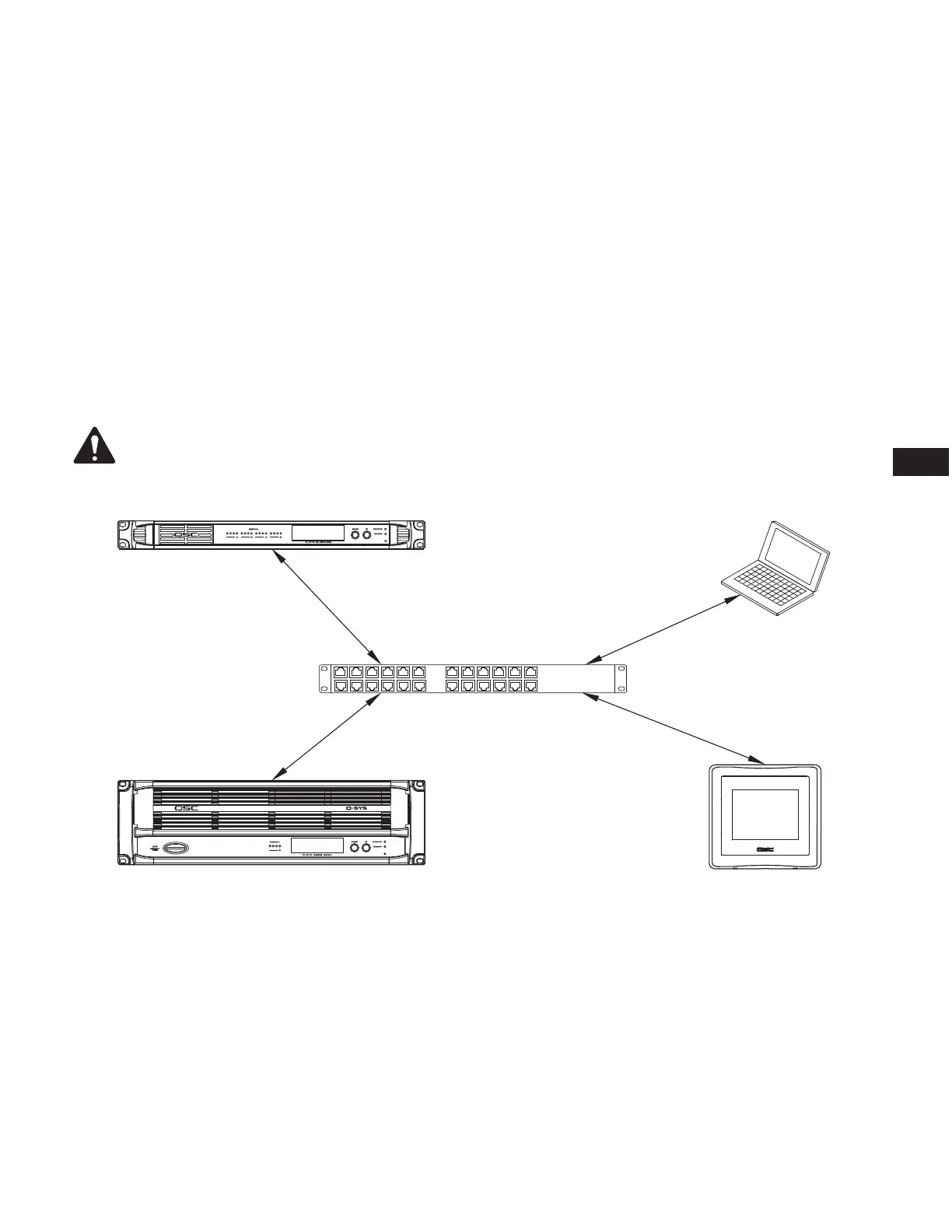 Figure 1 shows a very simple Q-LAN network implementation with a Q-Sys Core Processor, a Q-Sys I/O Frame, a Q-Sys TSC-3 touchscreen controller,