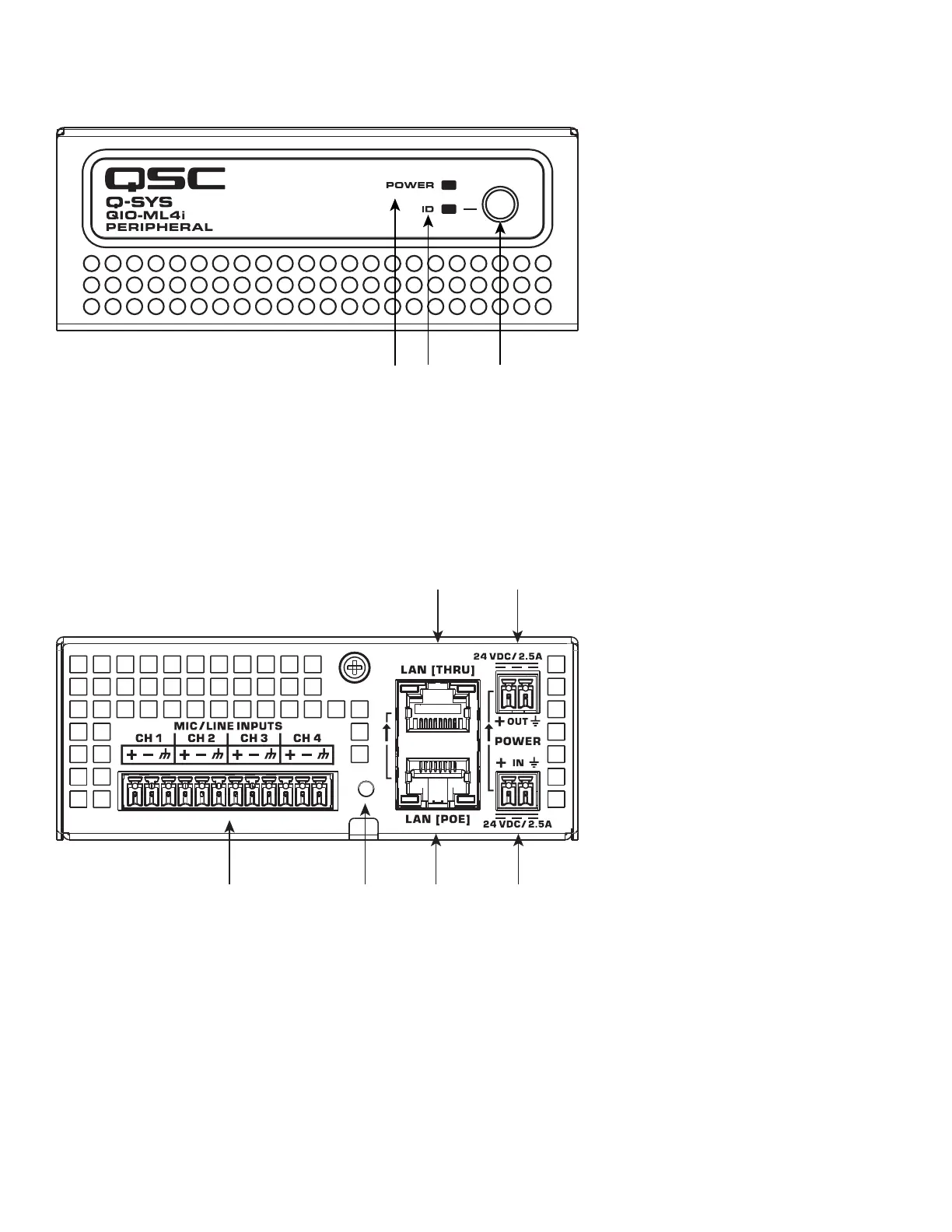 3. ID Button – Locates the QIO-ML4i in Q-SYS Designer Software and Q-SYS Configurator.