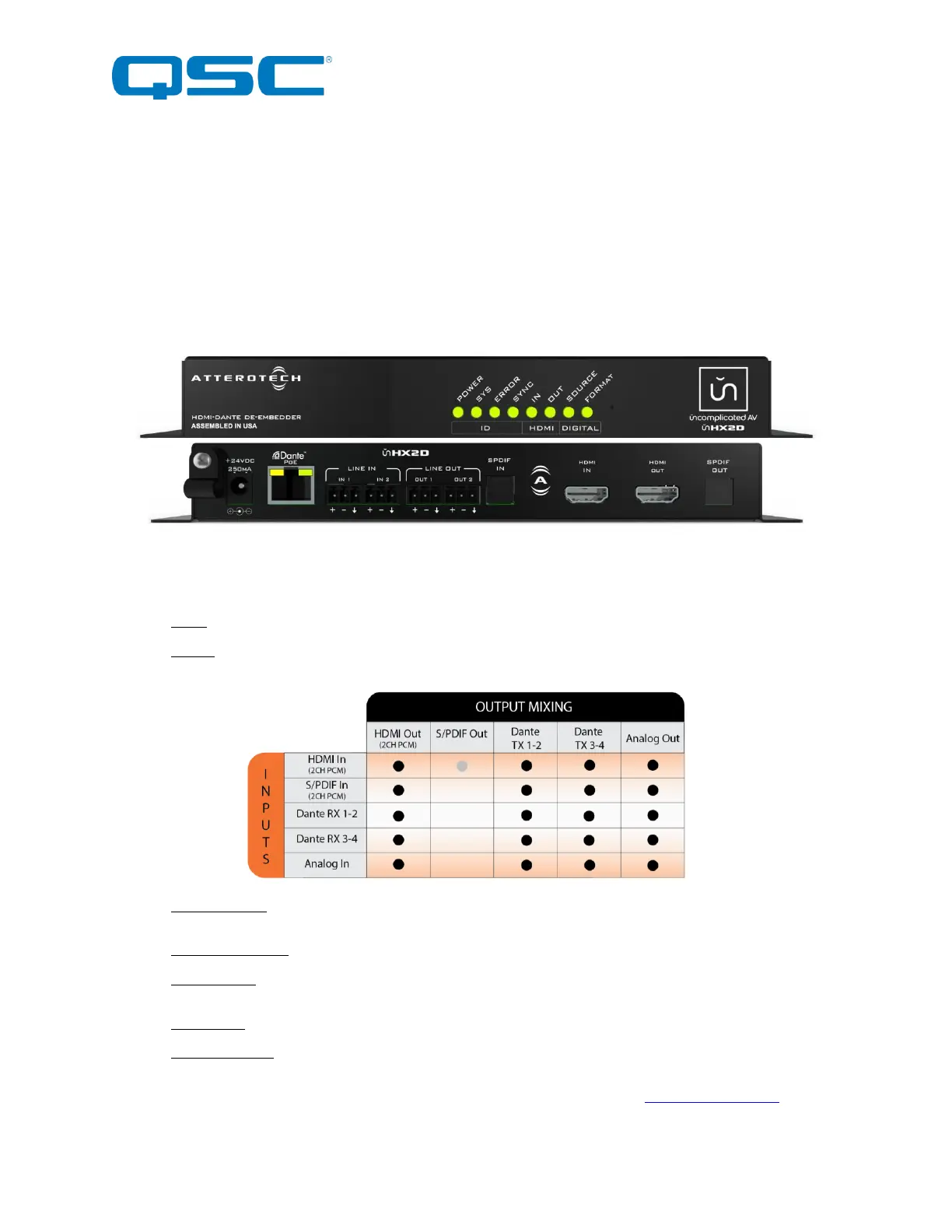 o Mixing - Flexible stereo matrix audio routing between system input sources and outputs and facilitates bridging