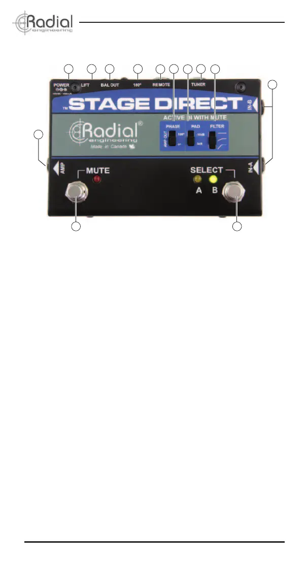 12. MuTE: Mutes the stage amp and balanced XLR outputs, leaving the