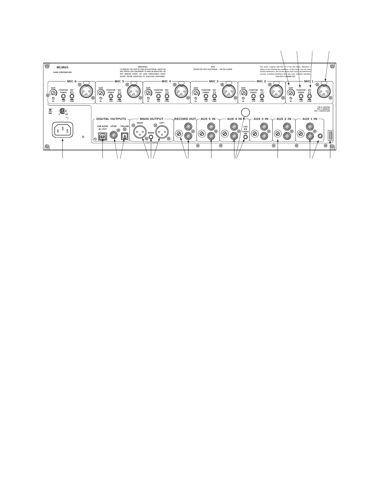 1 MIC/LINE INPUTS 1-6 are balanced XLR input jacks. Pin 1 is chassis ground (neutral), pin 2 is positive (+), and pin 3 is