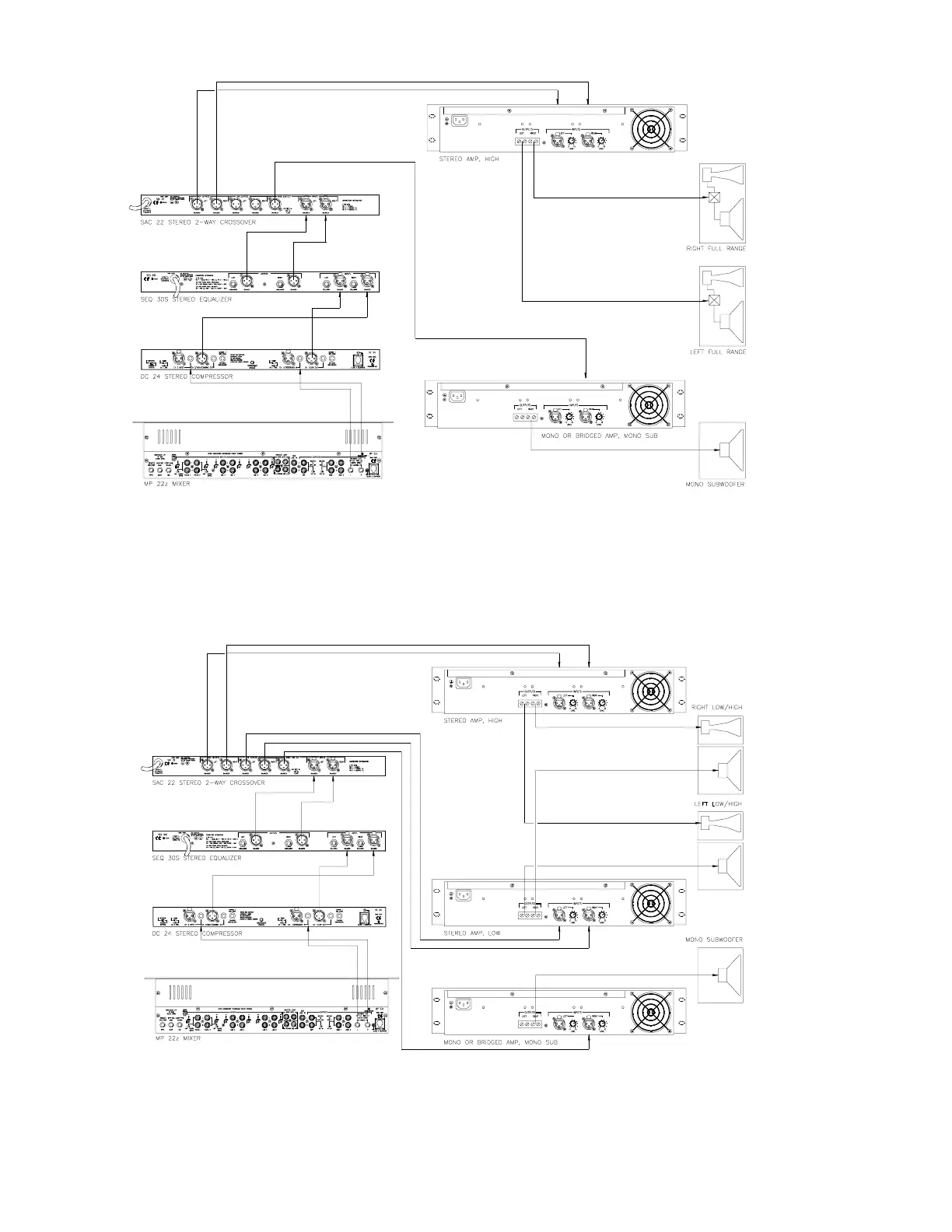 Use this configuration if you have full-range cabinets with passive crossovers built-in, i.e., no separate speaker inputs for