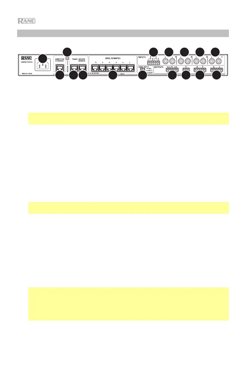 7. Zone Remotes Ports (RJ45, shielded Cat5e or Cat6 cables): Connect optional Rane