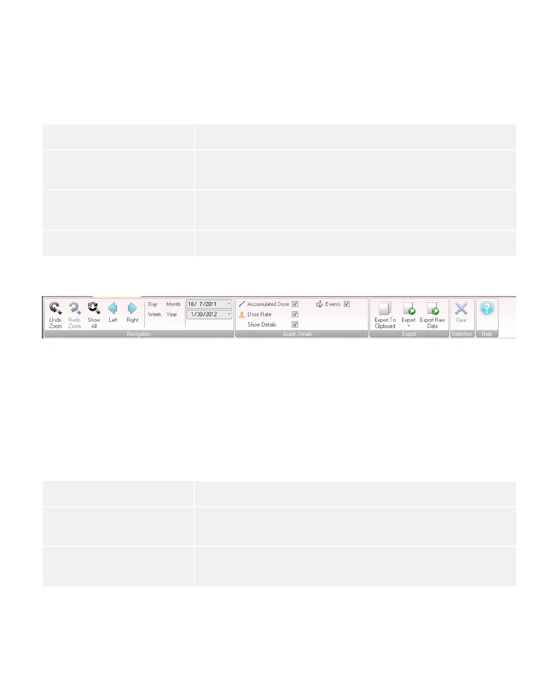 navigate in graphs and tables. The following items are available in the dose navigation toolbar: