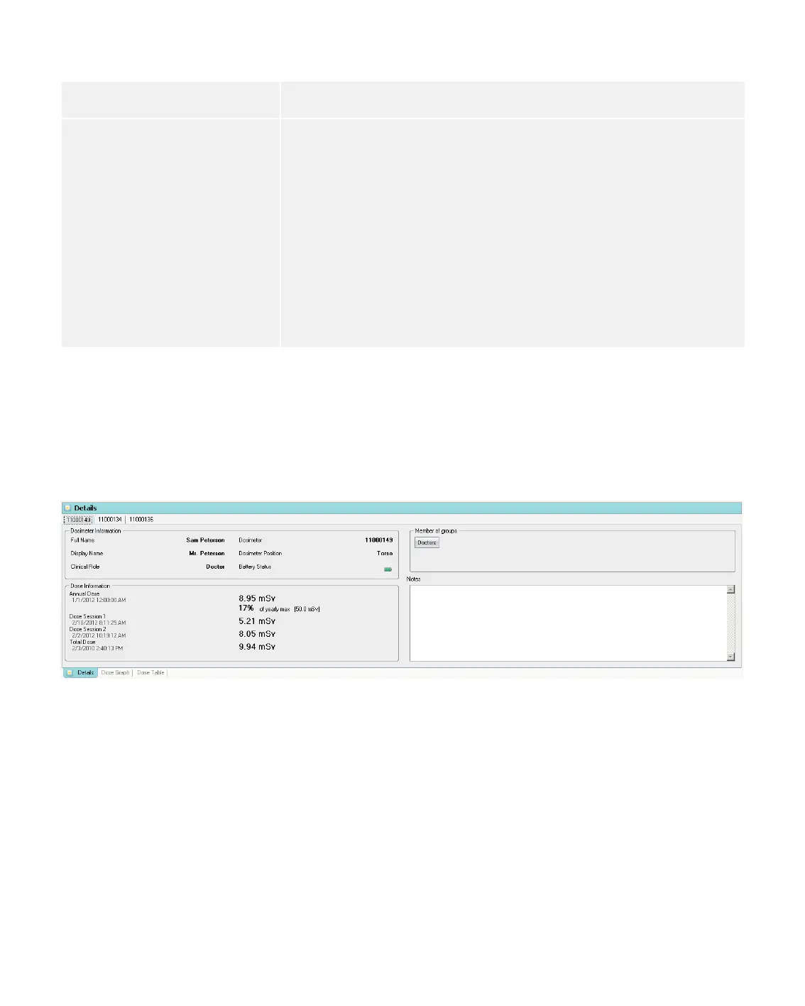 When a dosimeter is selected in the All dosimeters window, you can access the following information in the