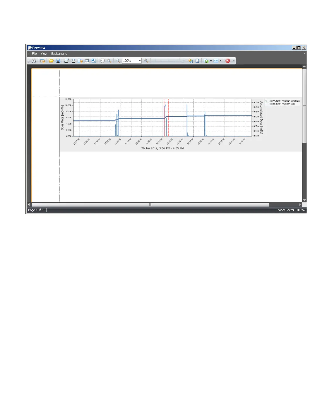 The currently viewed dose graph or dose table can be printed. The same data that is displayed will be printed.
