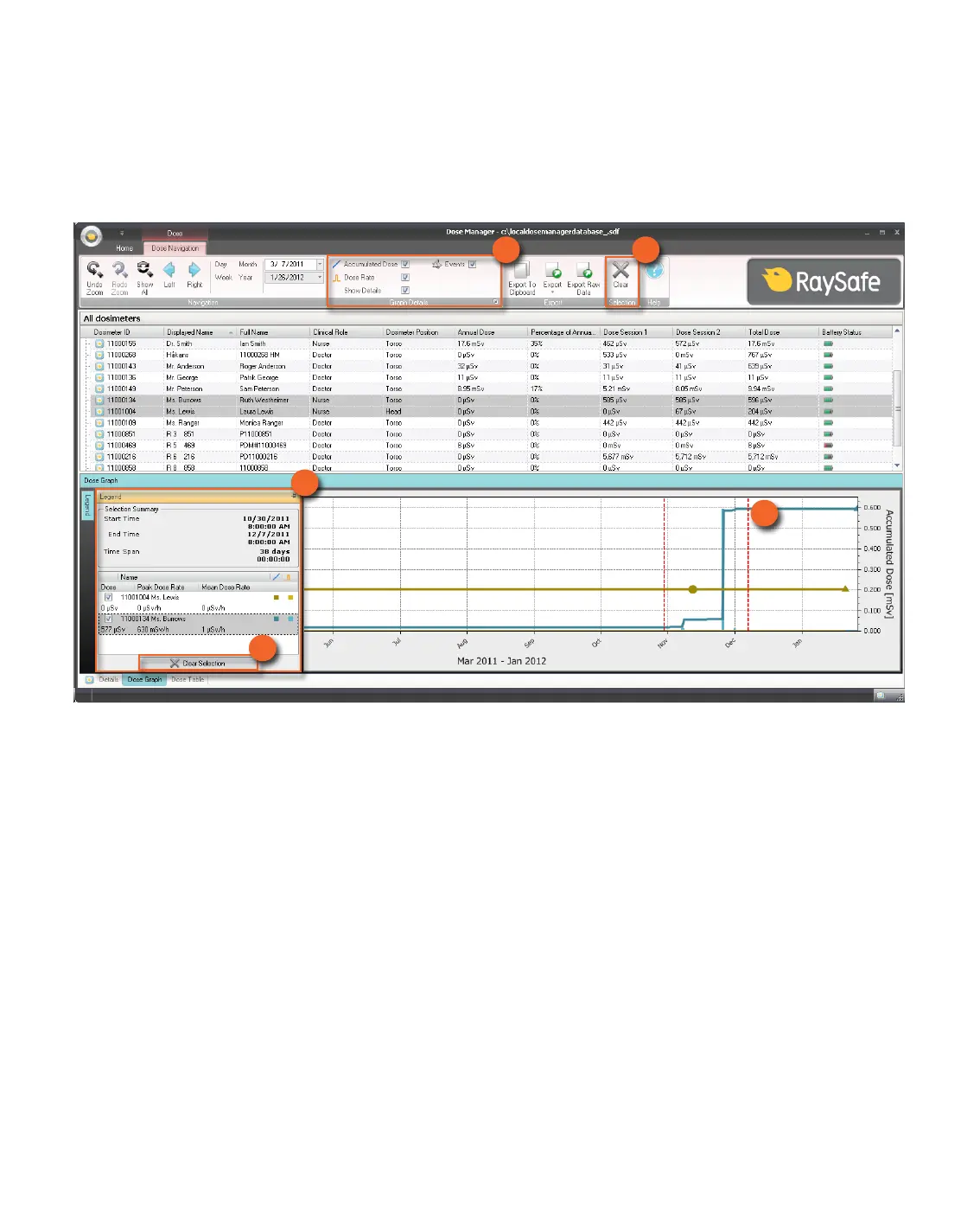 8. Click Clear, either in the graph legend or in the Dose Navigation toolbar, to clear your selection.