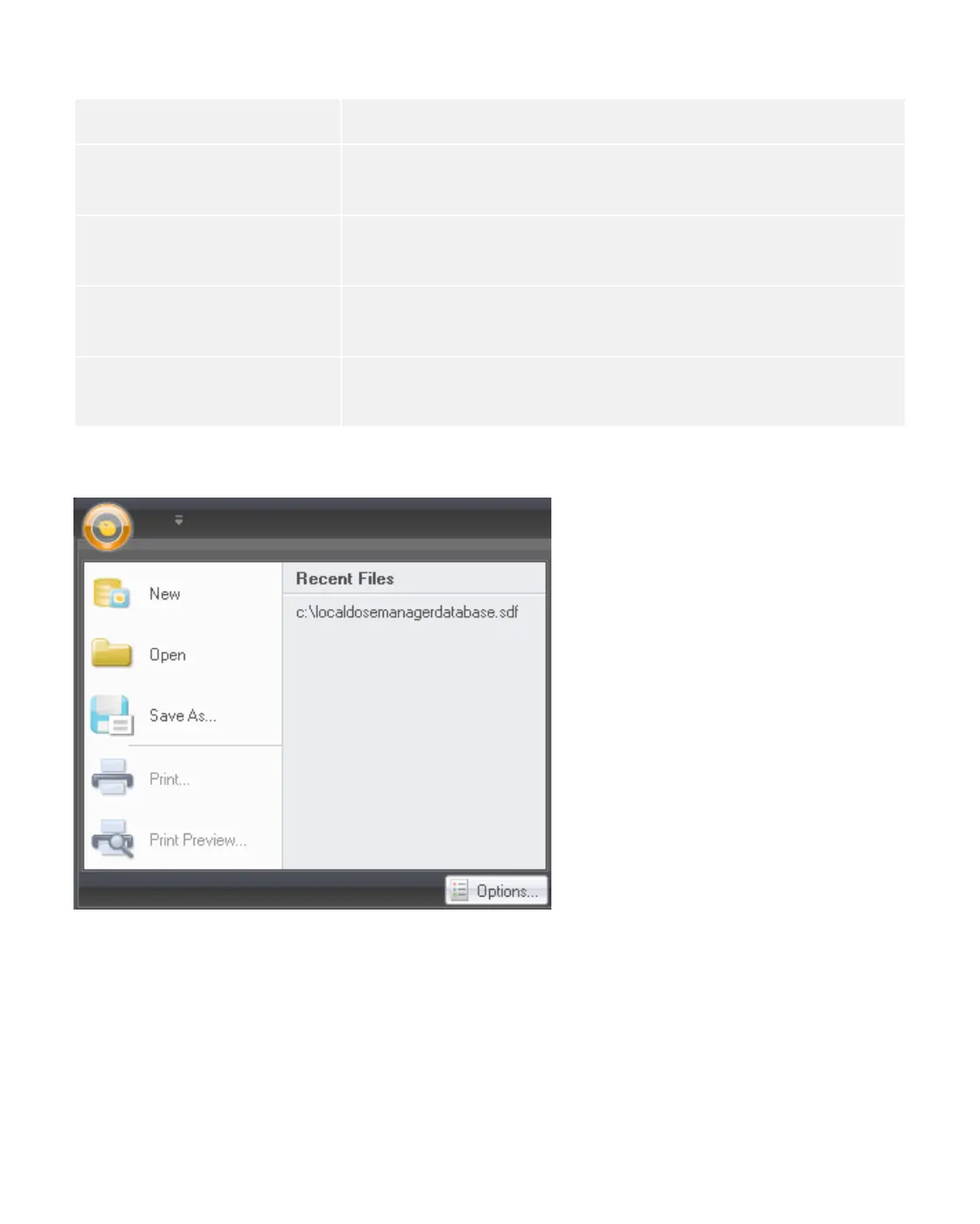 The application menu is where you work with dose manager databases and printing. This is also where you find