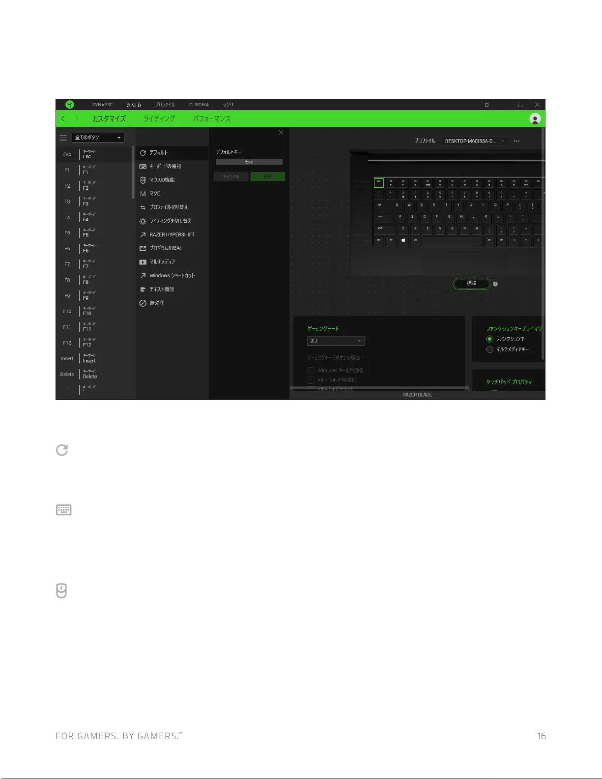 キー割り当てをキーボードの機能に変更するオプションです。またキーを押し込んでいる間はそのキ