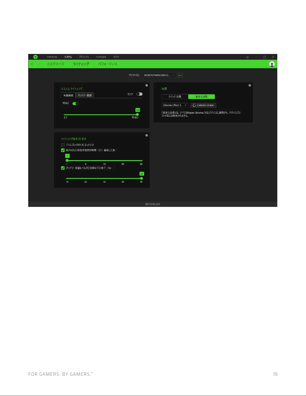 [明るさ] オプションを切り替えて Razer デバイスのライティングをオフにしたり、、スライダーを操作し