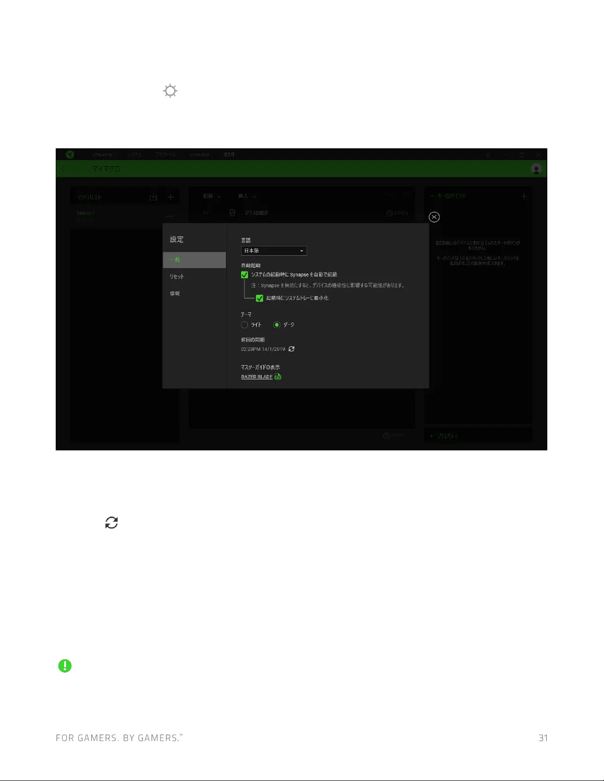 Razer Synapse 3 で ( ) ボタンをクリックしてアクセスできる [設定] ウィンドウでは、起動挙動と