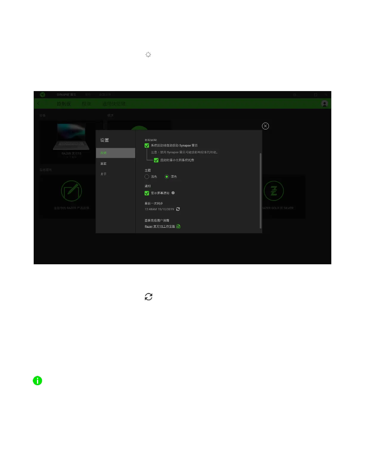单击 Razer Synapse 雷云 上的 ( ) 按钮即可打开“设置”窗口。你可以通过该窗口配置