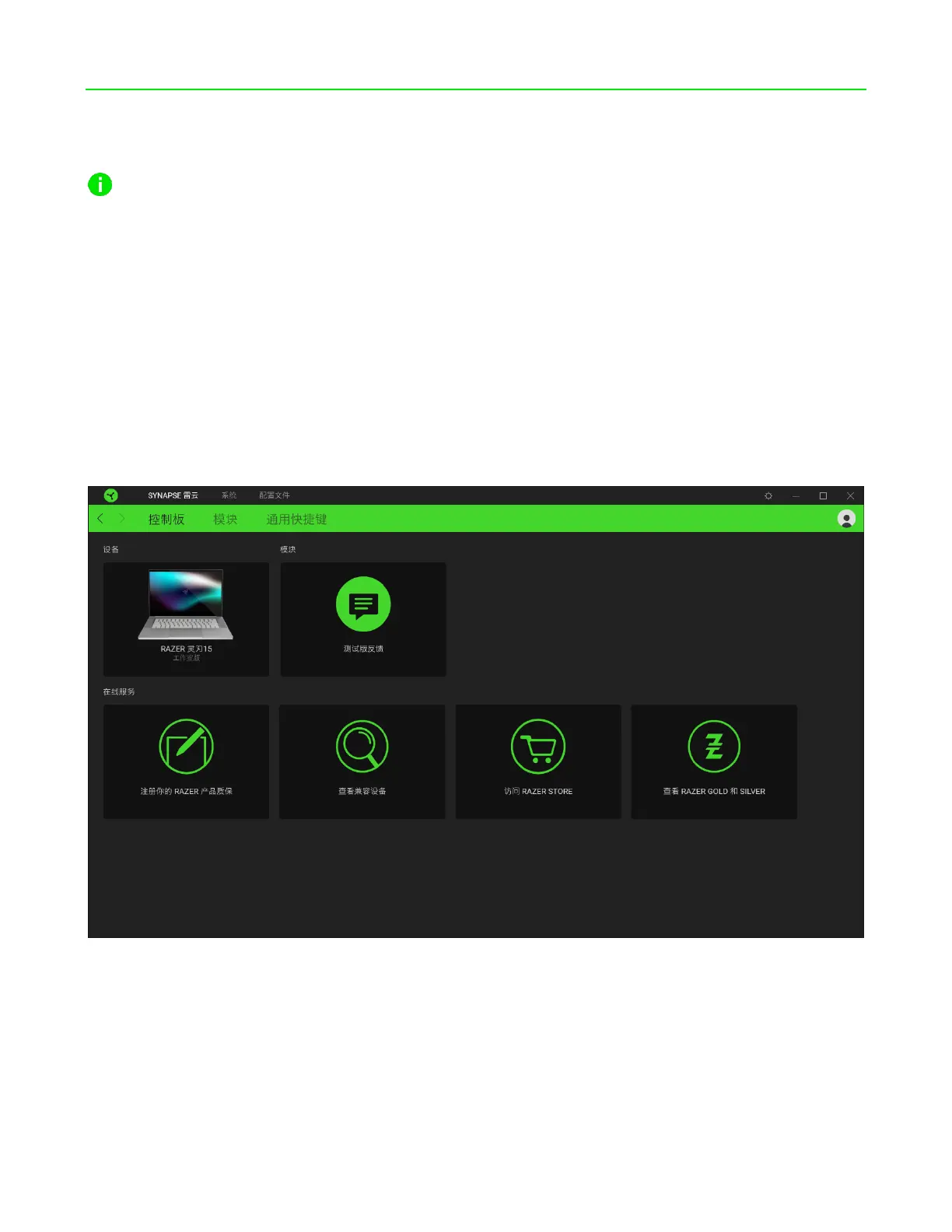 “控制板”子选项卡是 Razer Synapse 雷云 的总控制台,你可以在其中访问所有 Razer 设备