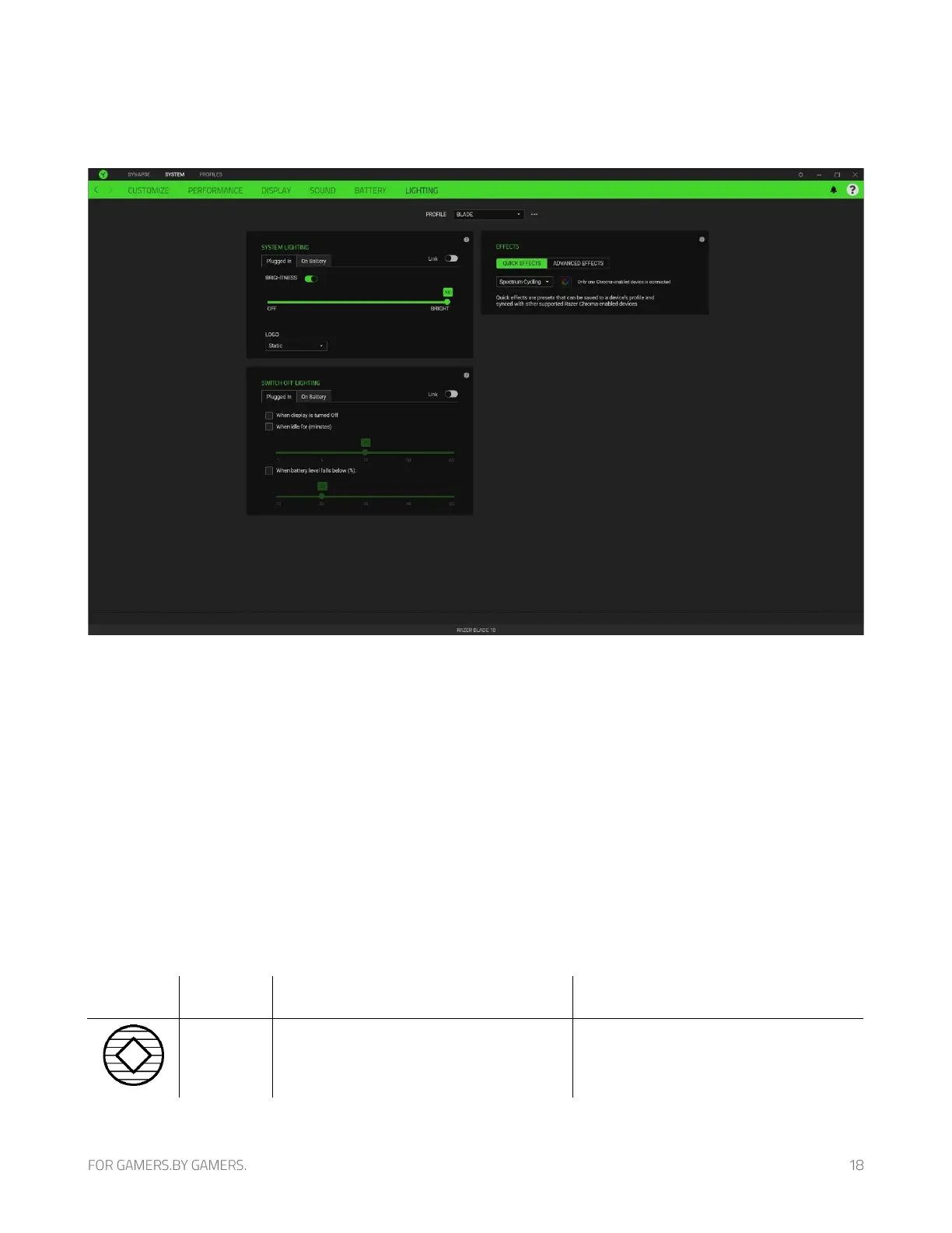 Razer 裝置的燈光,或使用滑桿來提高 / 降低亮度。如果你要為 Razer Blade 18 使用單一亮