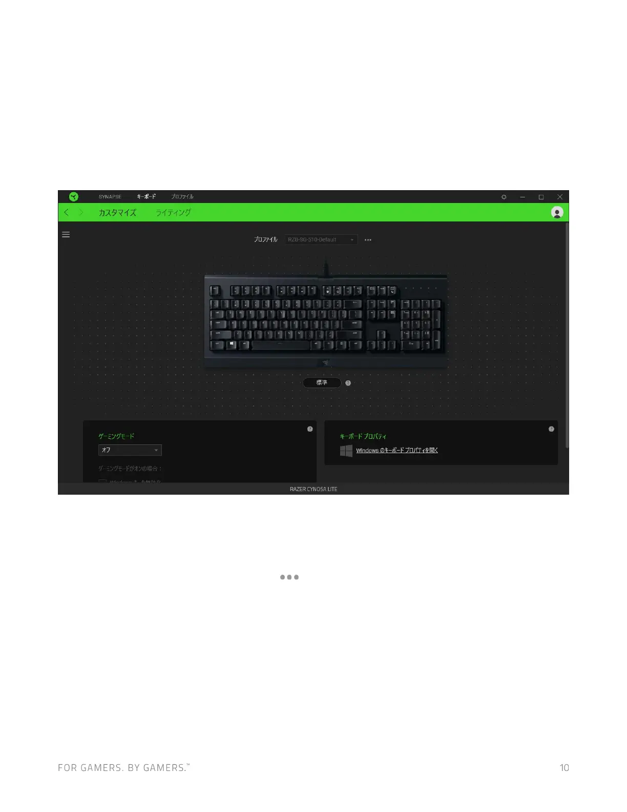 Razer Cynosa Lite のメインタブが [キーボード] タブです。ここではデバイスのキー割り当て、ゲーミ