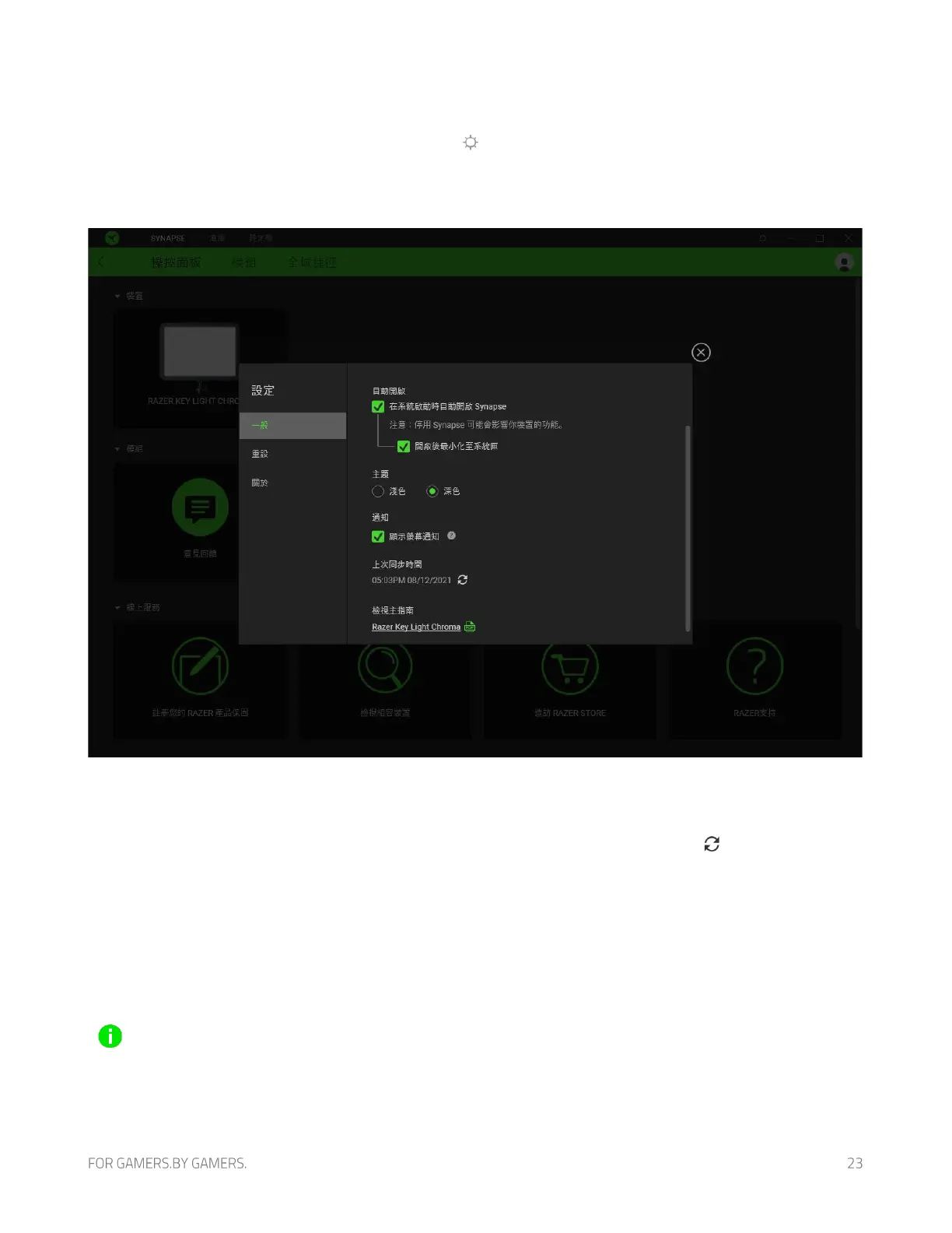 「設定」視窗(按一下 Razer Synapse 的 ( ) 按鈕即會顯示)可讓你設定 Razer Synapse