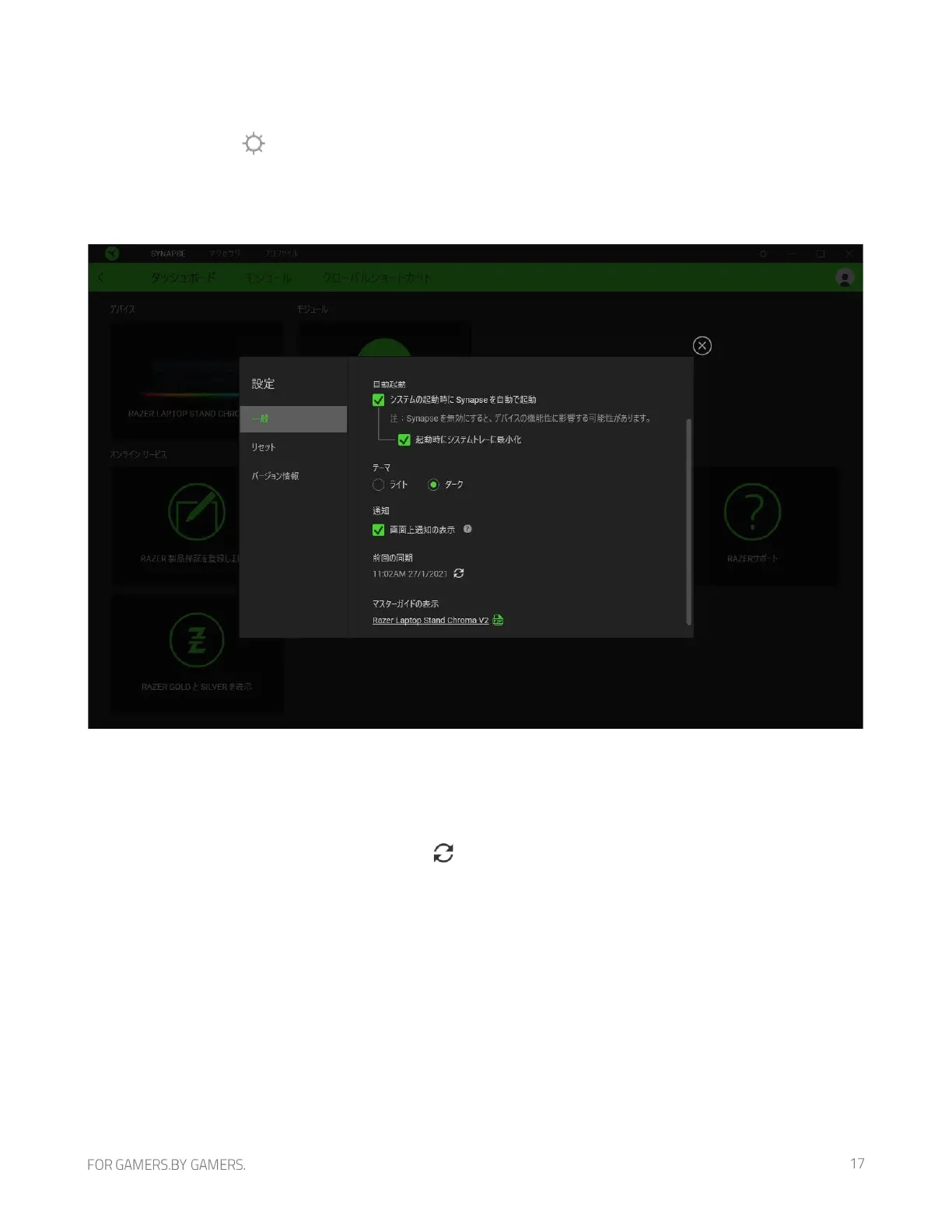 ができます。さらに、プロファイルとクラウド ( ) の手動同期や、接続したすべての Razer デバイス