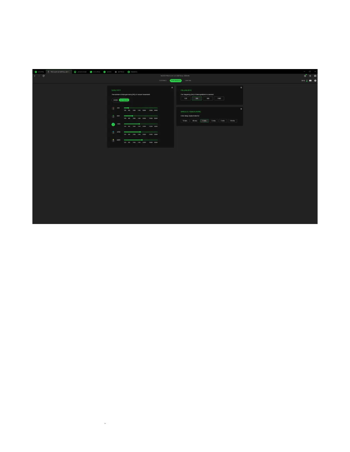The Performance subtab enables you to adjust the sensitivity, polling rate, and wireless power