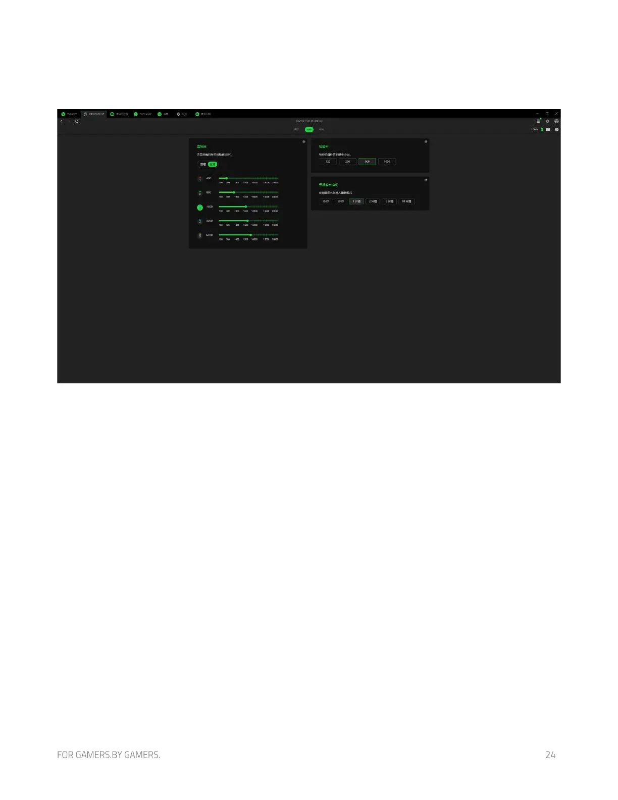 「效能」子分頁可讓你修改 Razer 滑鼠的靈敏度、輪詢率,以及無線省電模式。