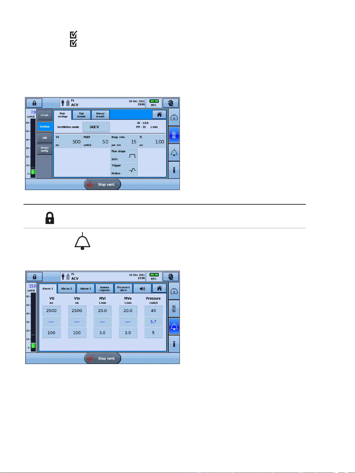 • Settings—to view the ventilation mode and access Manual Breath and Sigh Breath screens