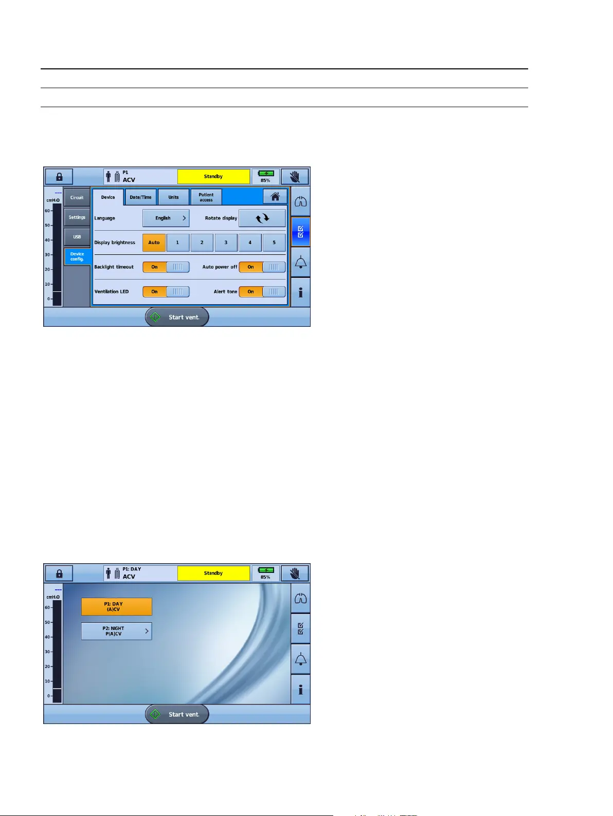 Patient home screen. You can change between programs while the Astral device is delivering ventilation.