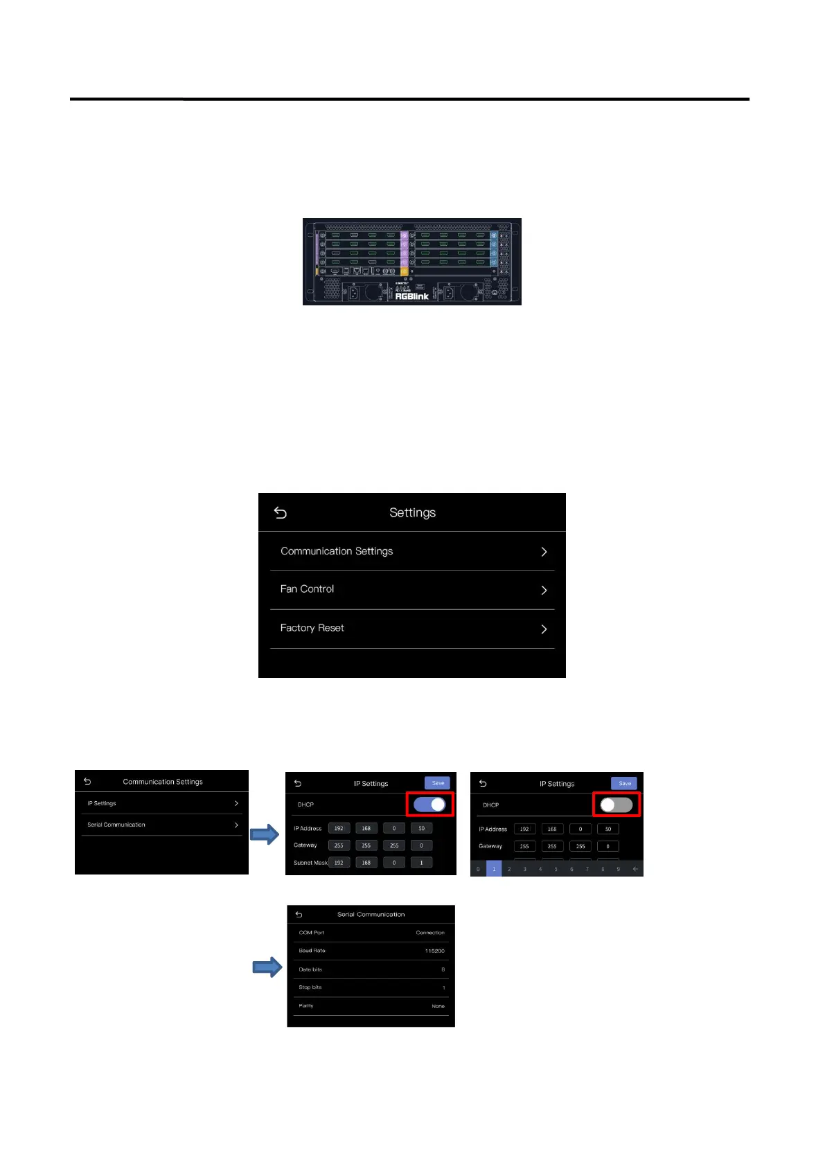 Click [Settings] to enter the page, which includes Communication Settings, Fan Control, Factory Reset.