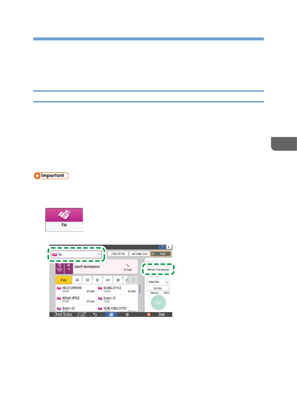 2. Check that [Fax] and [Memory Transmission] are displayed on the fax screen.