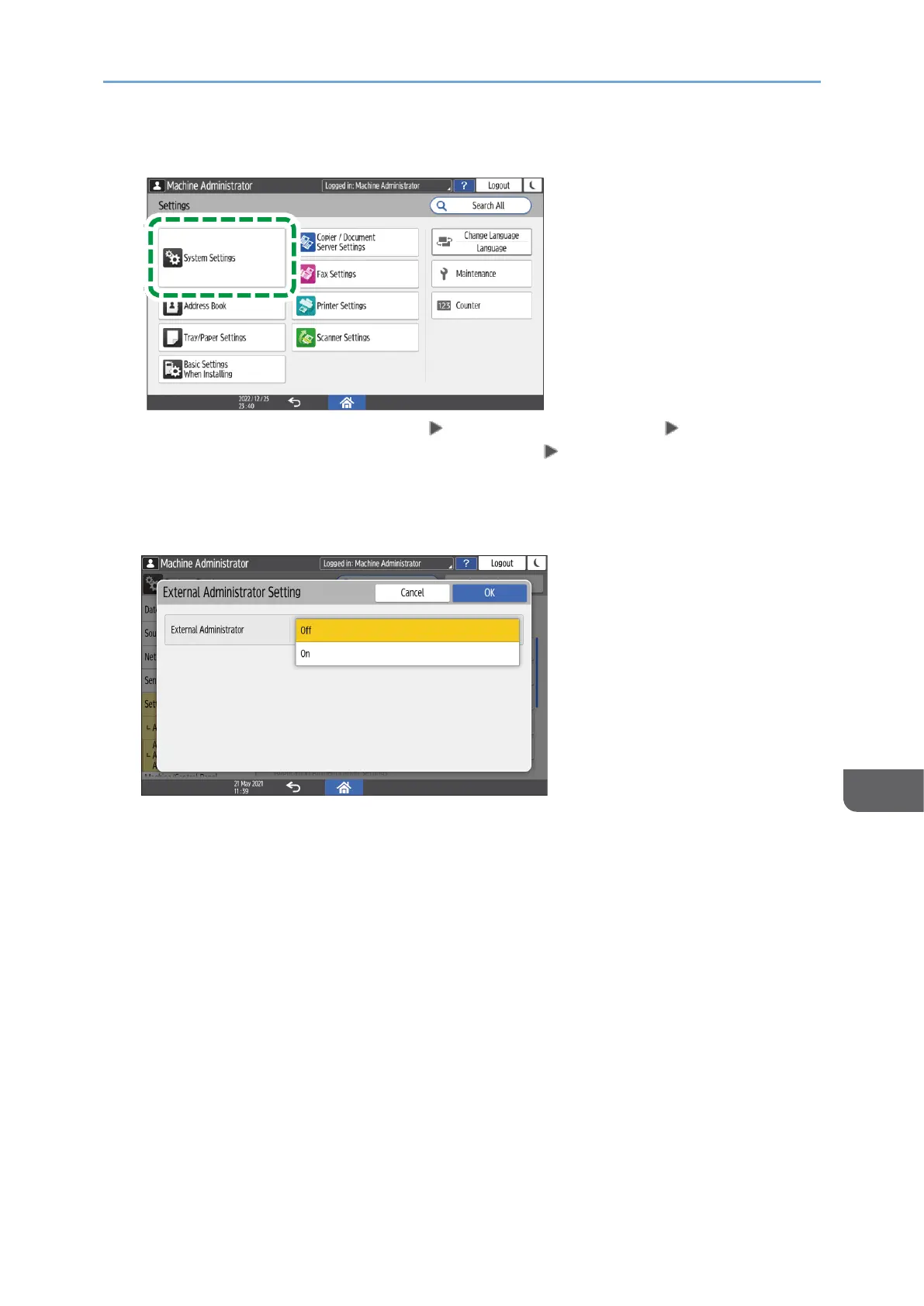 6. Select [On] from the list next to External Administrator, and then press [OK].
