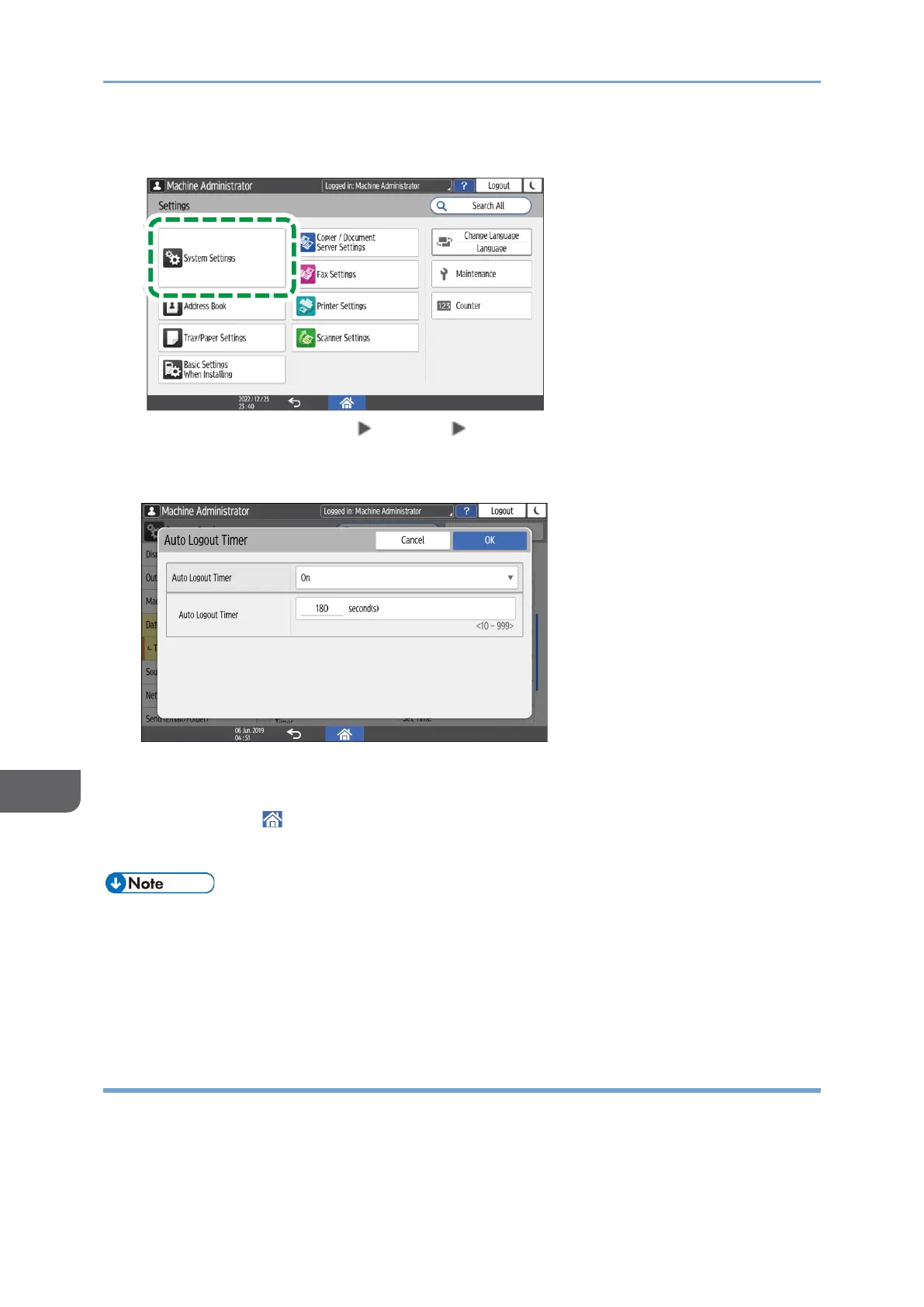 4. Press [Date/Time/Timer] [Timer] [Auto Logout Timer].