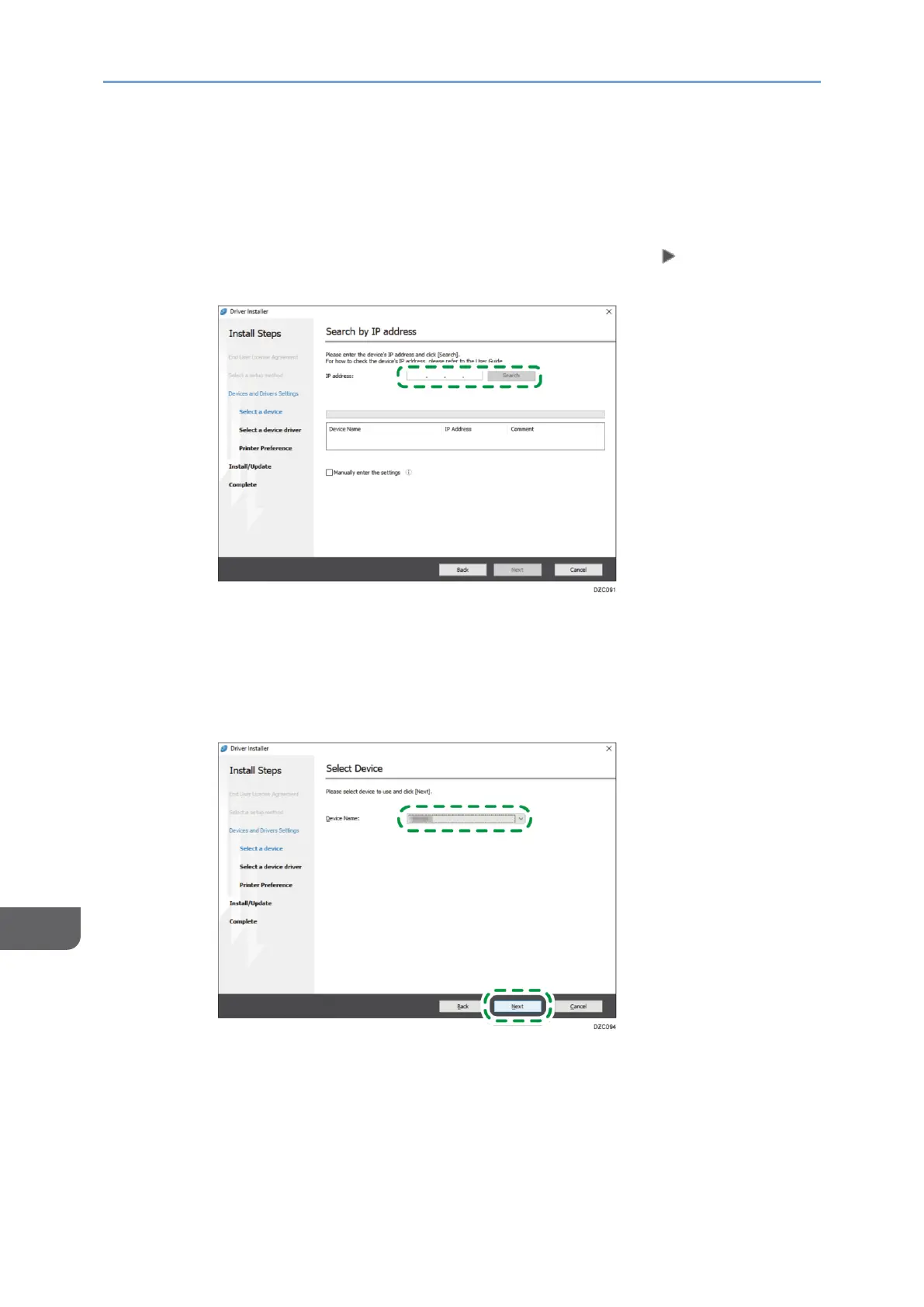 2. Select [Specify device IP address] or [Specify device name], and then click [Next].