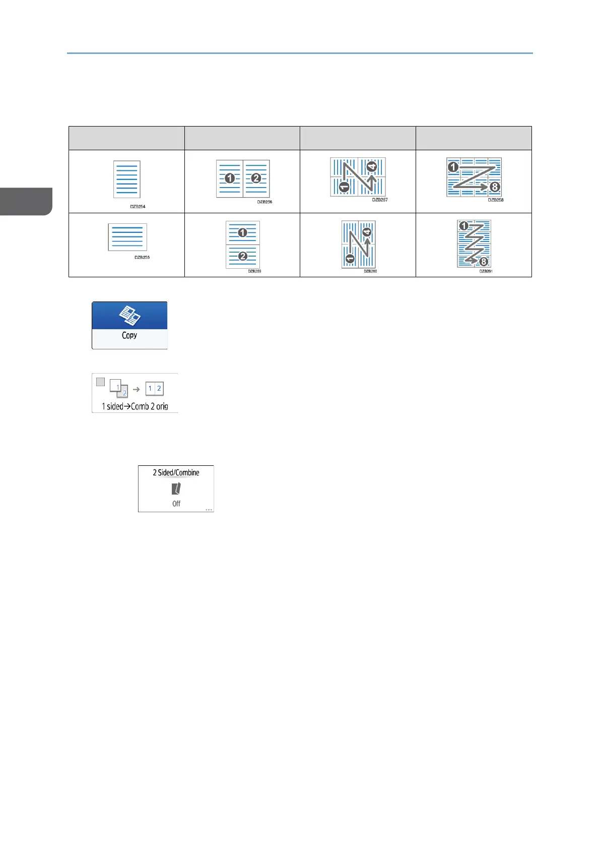 2. On the Copy screen, press [1 sided→Comb 2 orig].