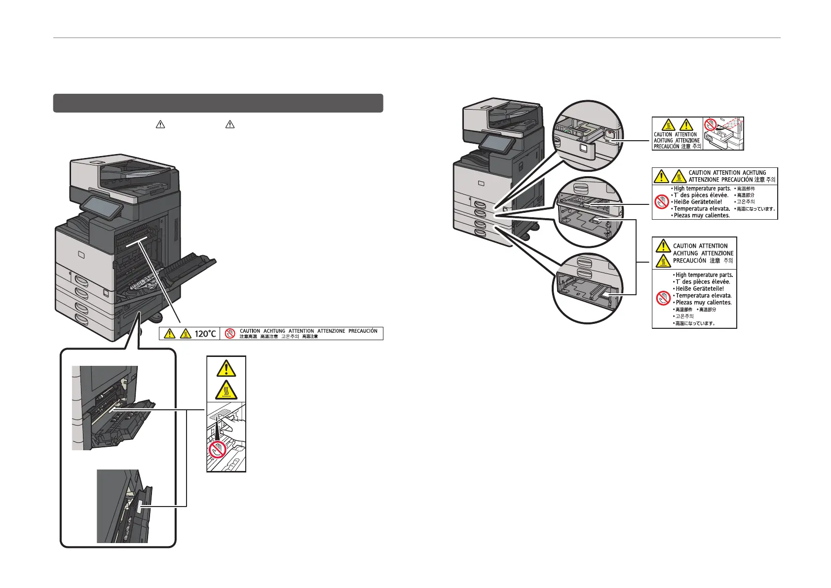 The inside of the machine could be very hot. Do not touch the parts which a label is put on.