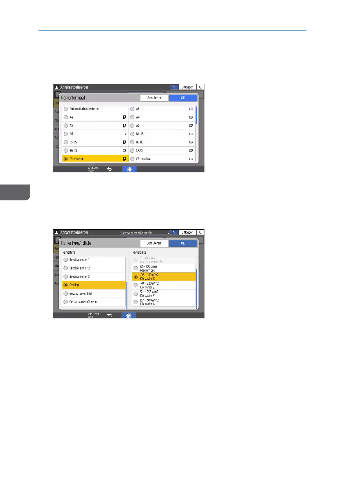 7. Druk op [Papiertype/-dikte] en selecteer [Envelop] bij "Papiertype".