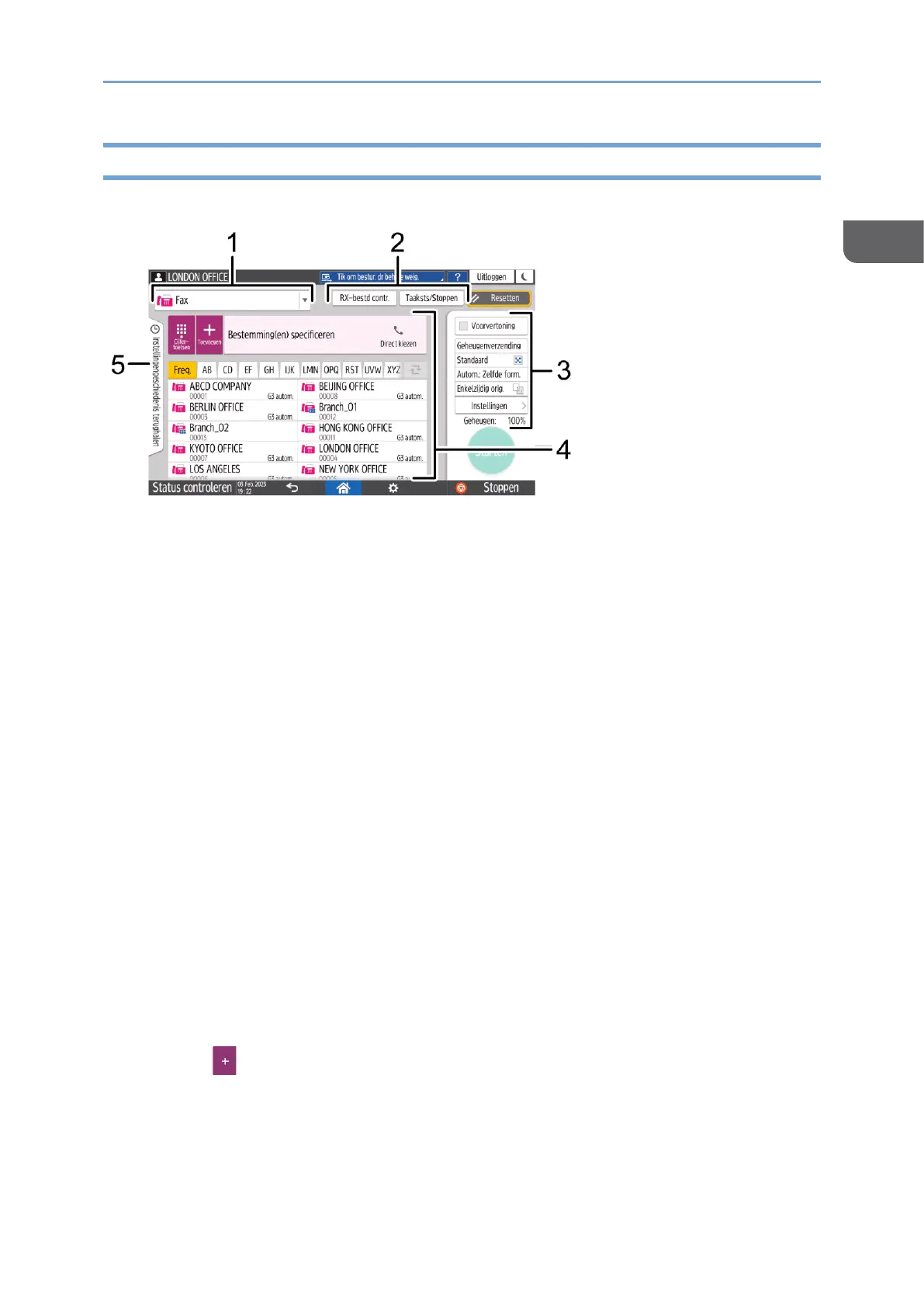 Er zijn vijf typen functies en instellingen in het Faxscherm.