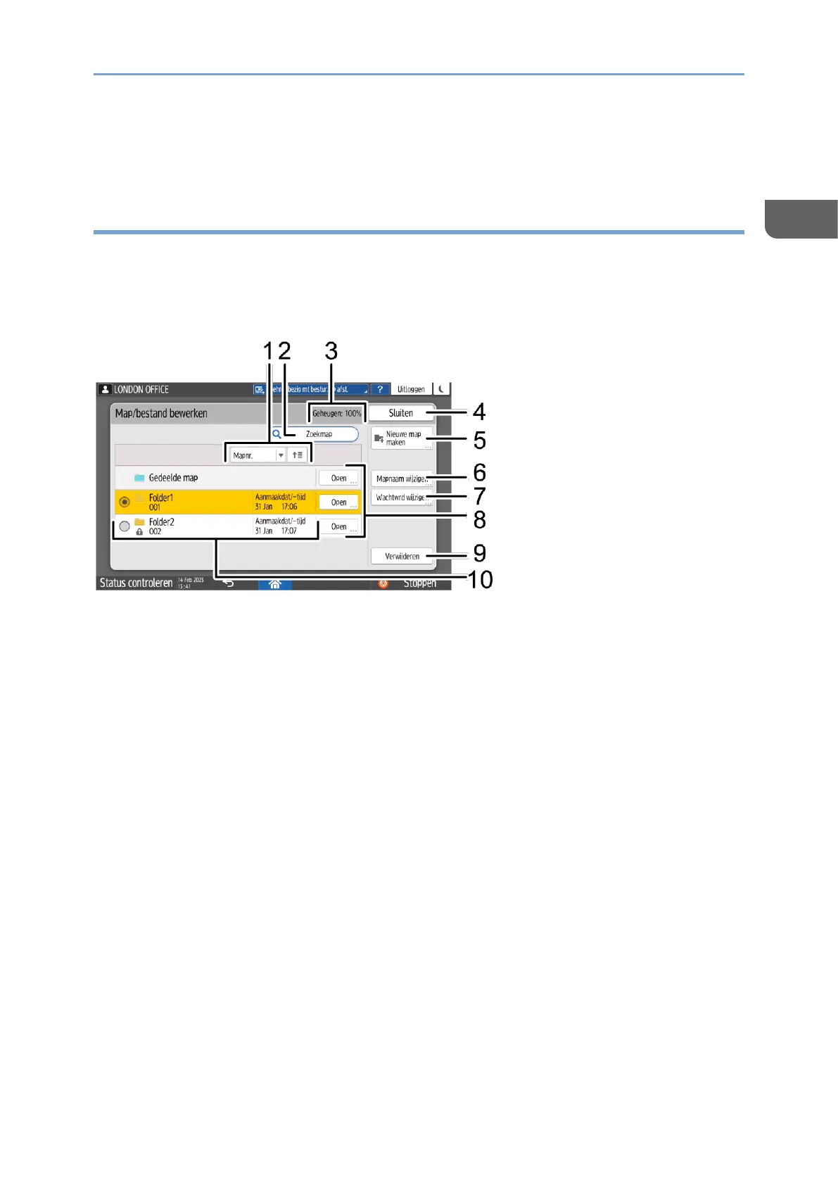 Druk hierop om de mappen te sorteren op [Mapnr.], [Mapnaam] of [Datum/Tijd].