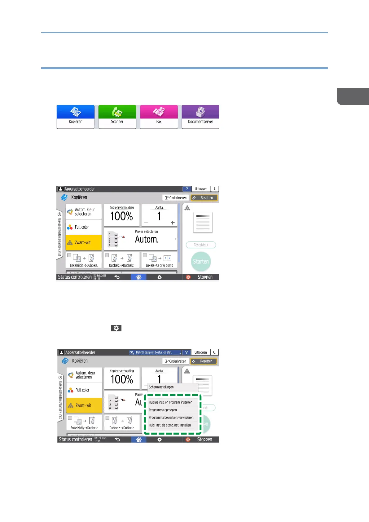 1. Druk op het Home-scherm op [Kopiƫren], [Faxen], [Scanner] of [Documentserver].
