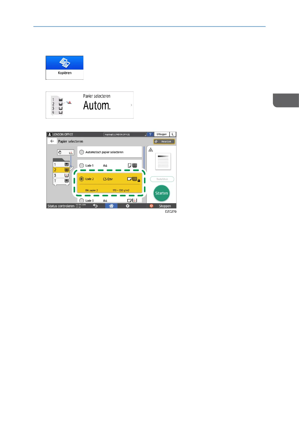 3. Druk op de keuzetoets voor de papierlade op het scherm Kopiëren.