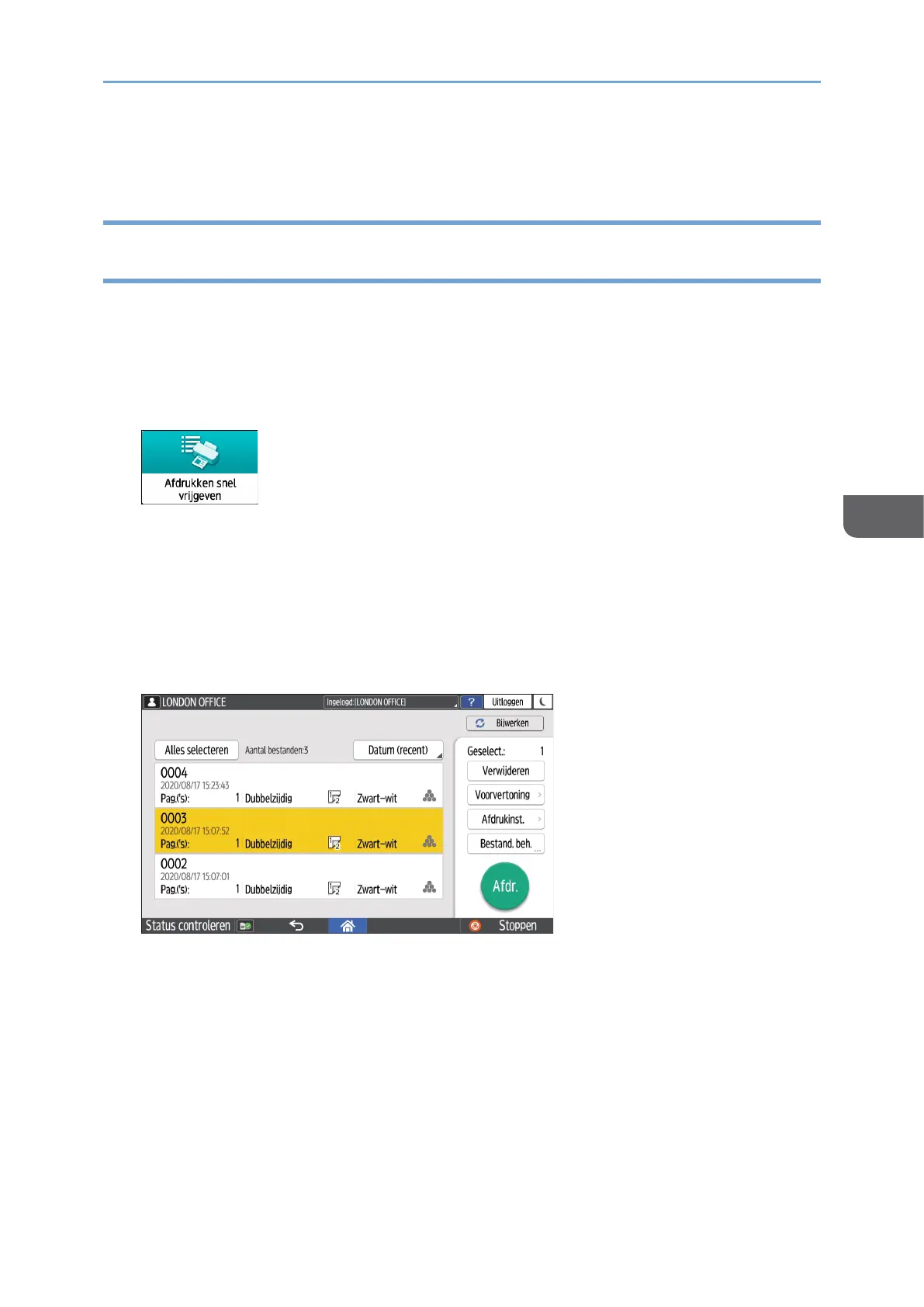 apparaat, drukt u af met Afdrukken snel vrijgeven op het bedieningspaneel. De