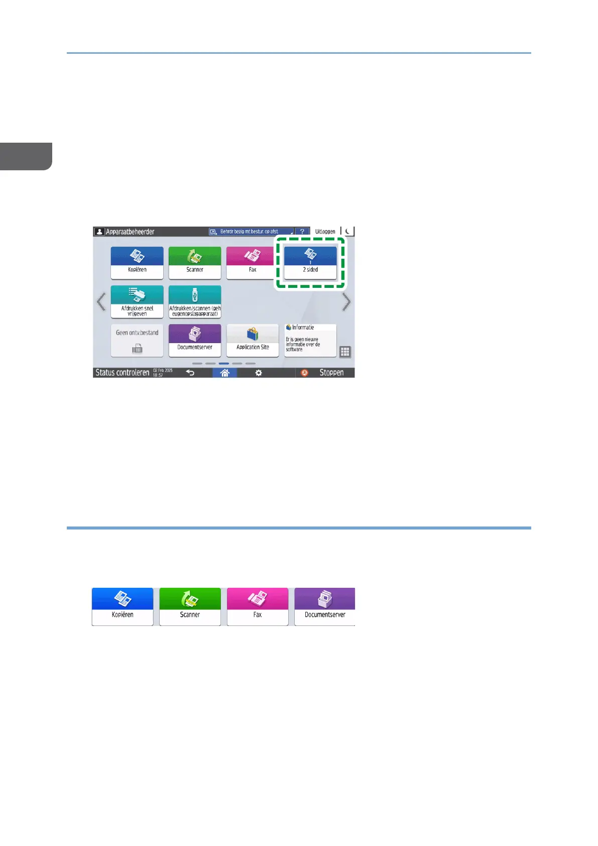 1. Druk op het Home-scherm op [Kopiƫren], [Faxen], [Scanner] of [Documentserver].
