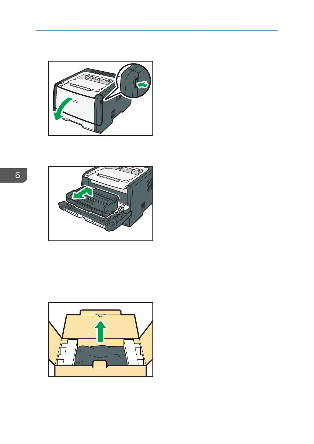 新しいトナーカートリッジを箱から取り出し、ポリ袋から取り出します。