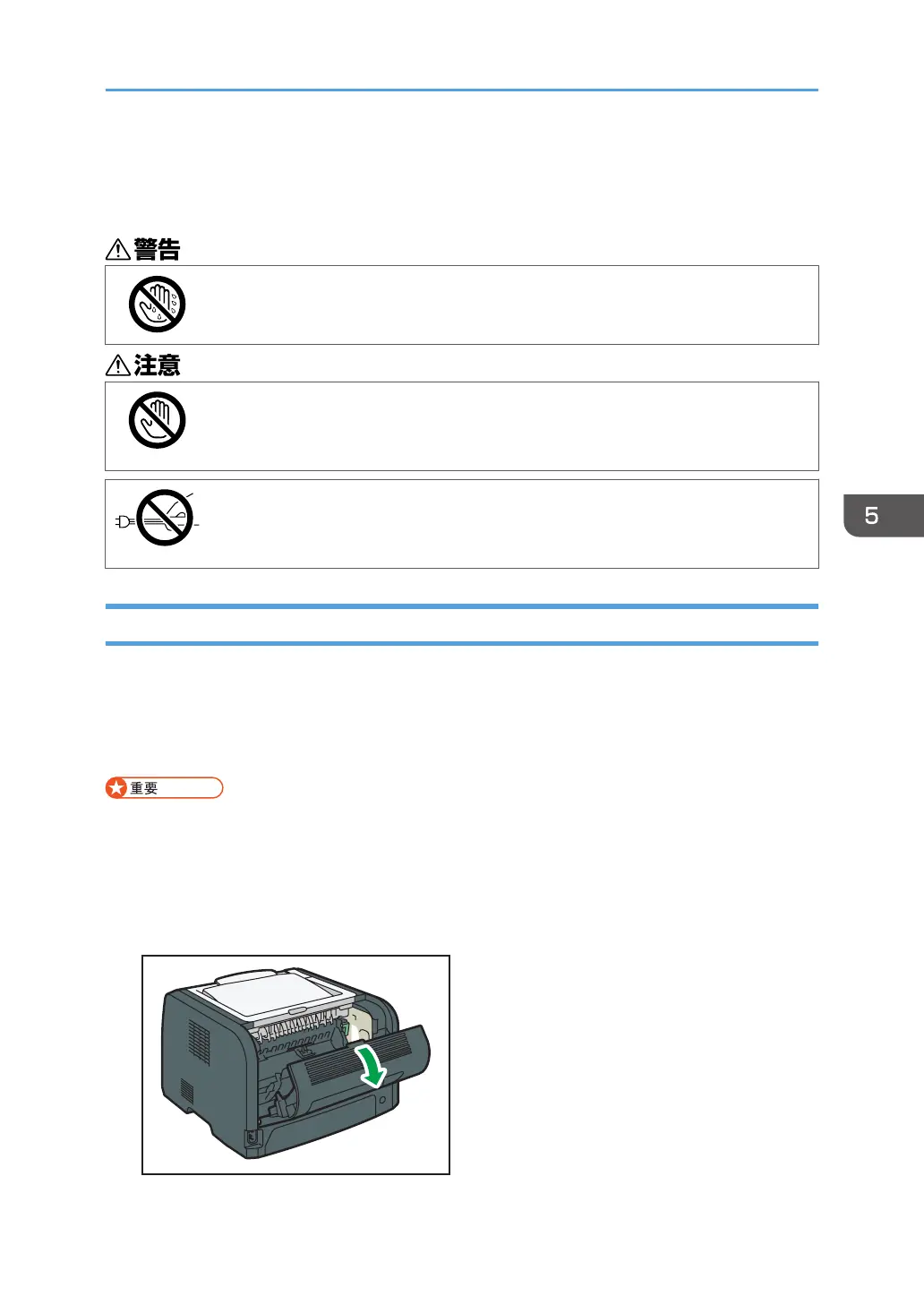 • 機械内部には高温の部分があります。紙づまりを取り除くときは、本