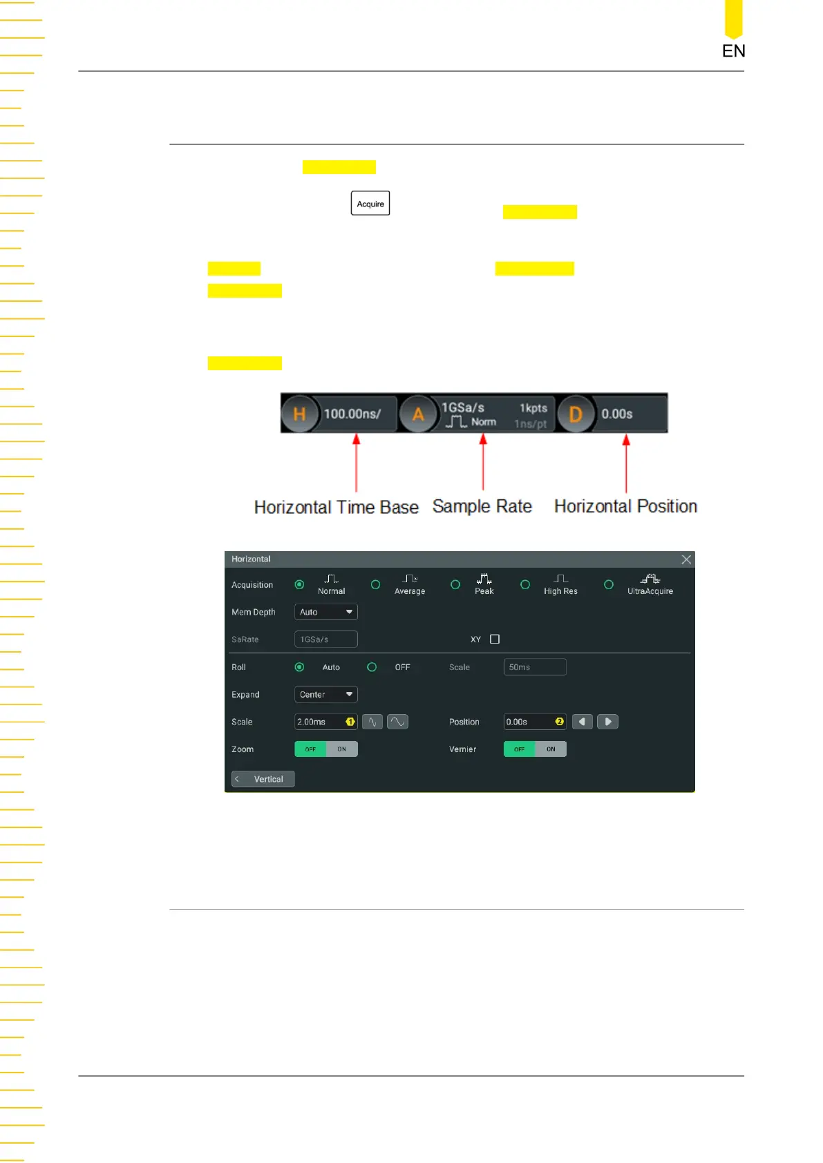 • Click or tap the horizontal time base label ("H" icon), acquisition label ("A" icon),