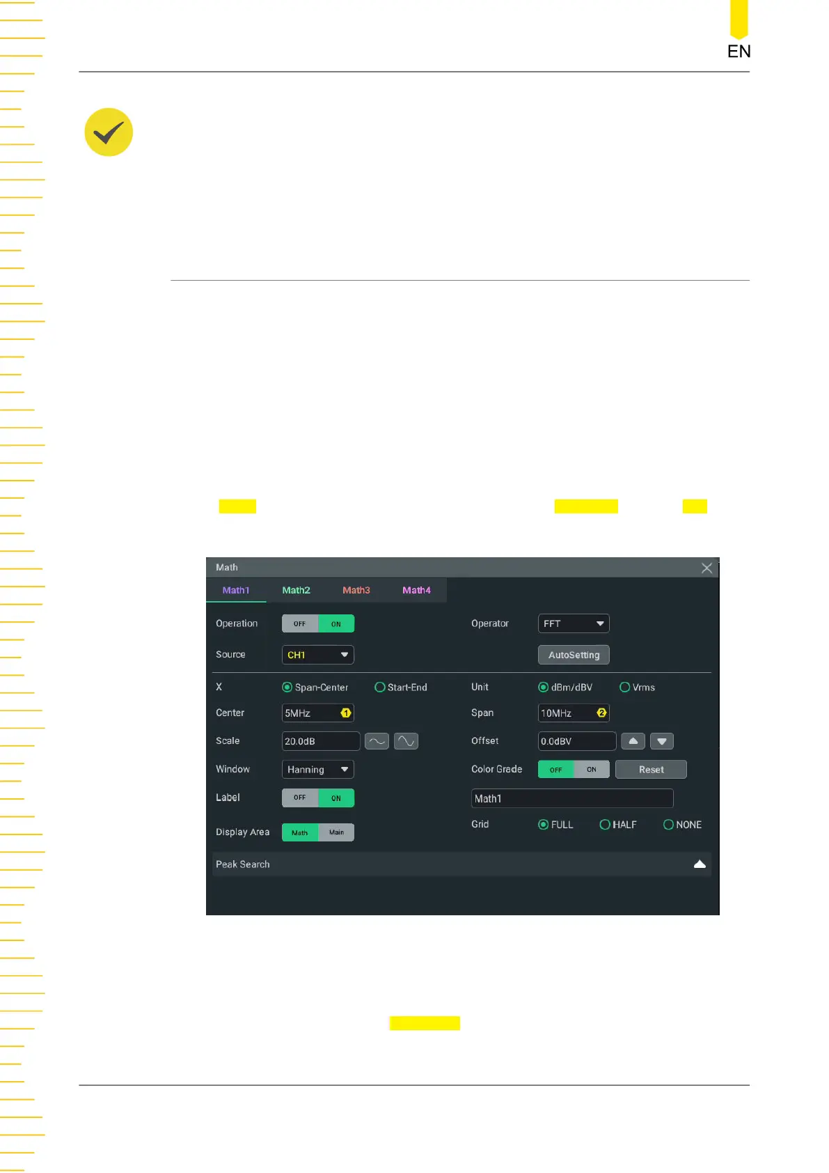 Math1, Math2, and Math3. The selected Math channel and operation status will automatically