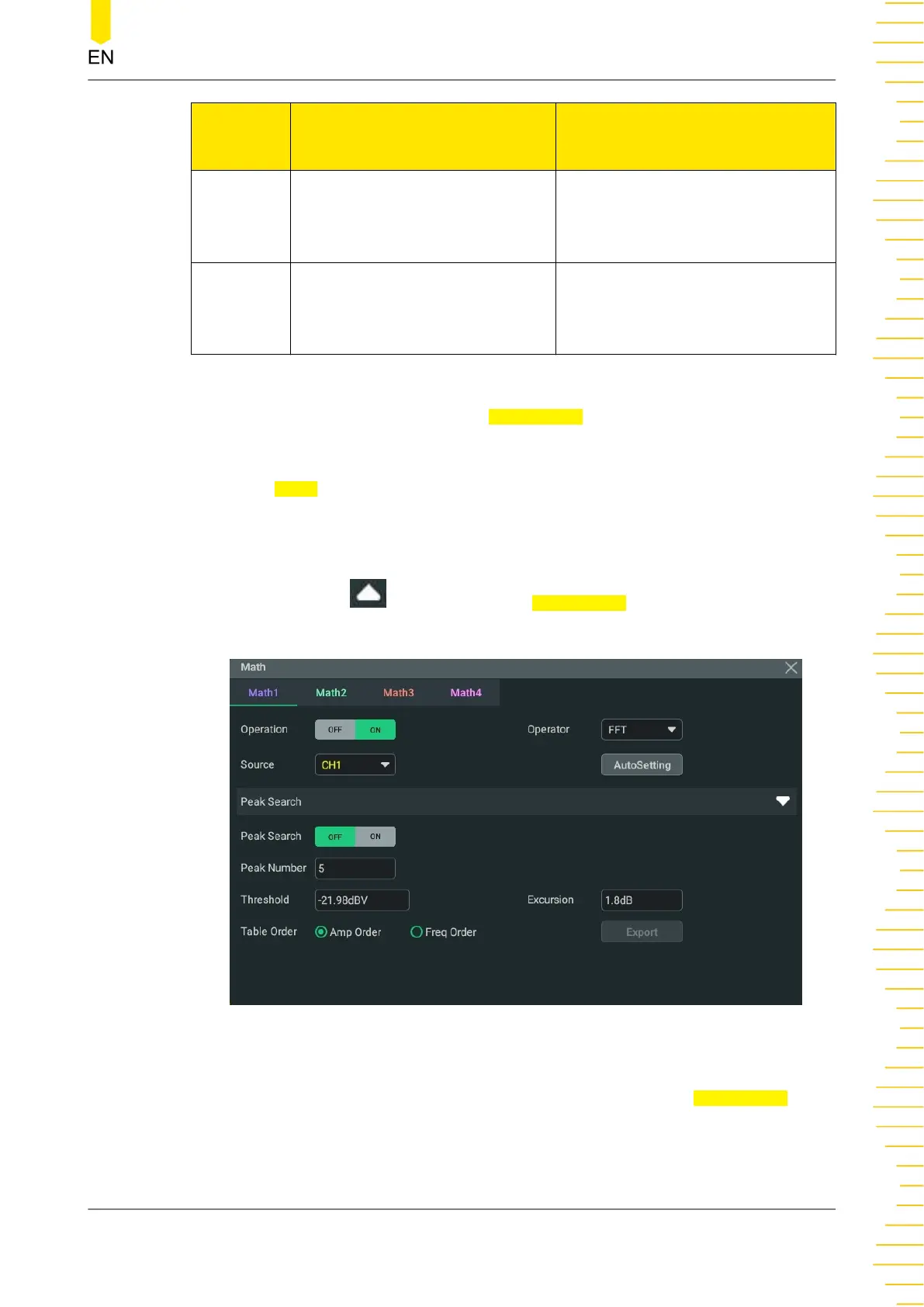 • Peak Search ON/OFF: click or tap the ON/OFF button for the Peak Search menu