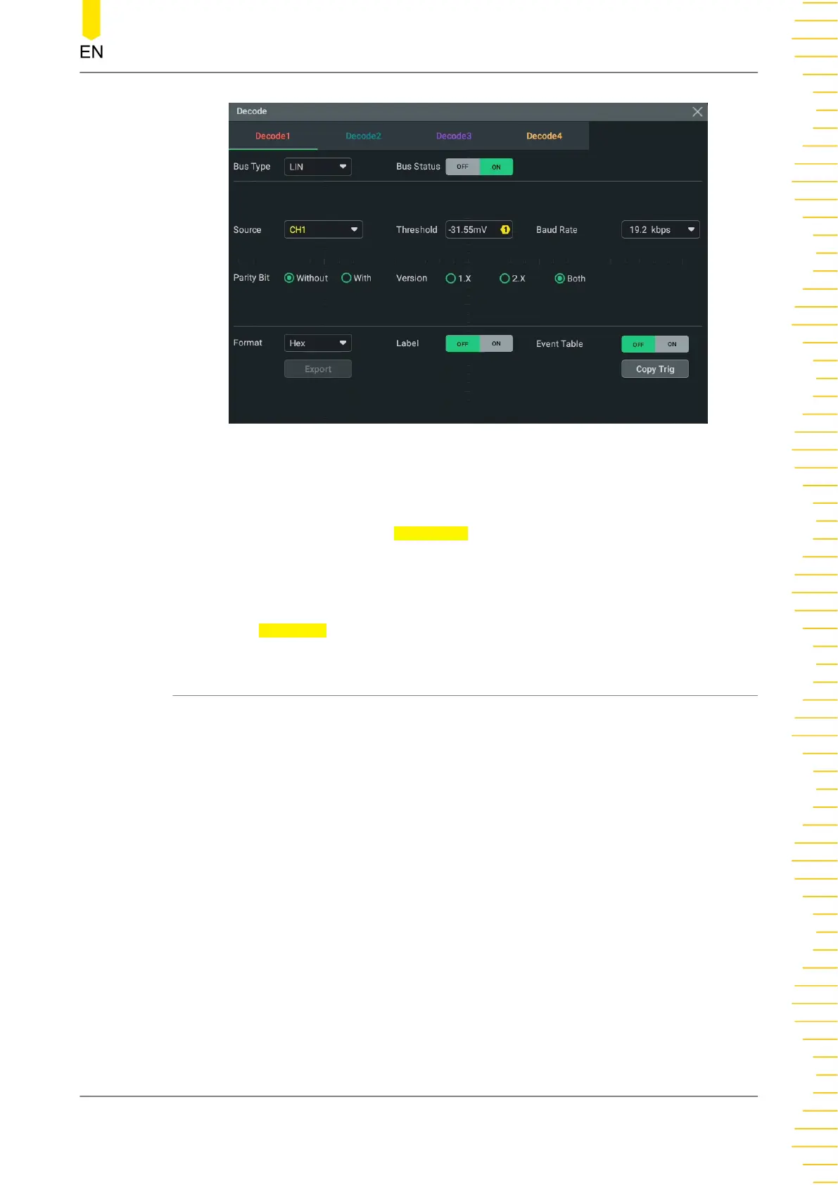 Copy trig indicates applying the trigger settings to the specified decoding setting.