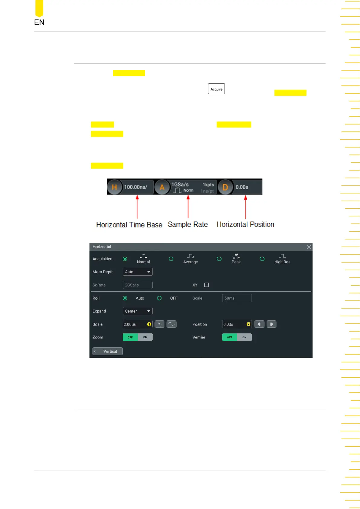 • Click or tap the horizontal time base label ("H" icon), acquisition label ("A" icon),