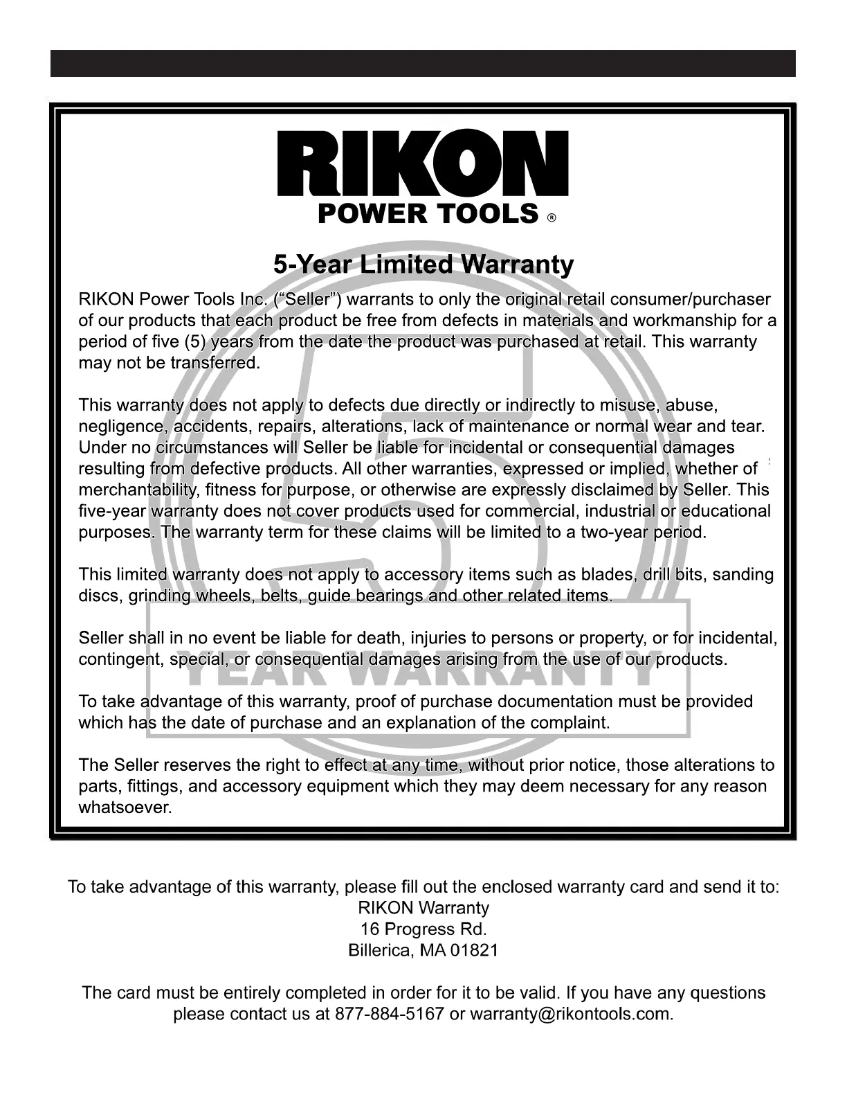 RIKON Power Tools Inc. (“Seller”) warrants to only the original retail consumer/purchaser