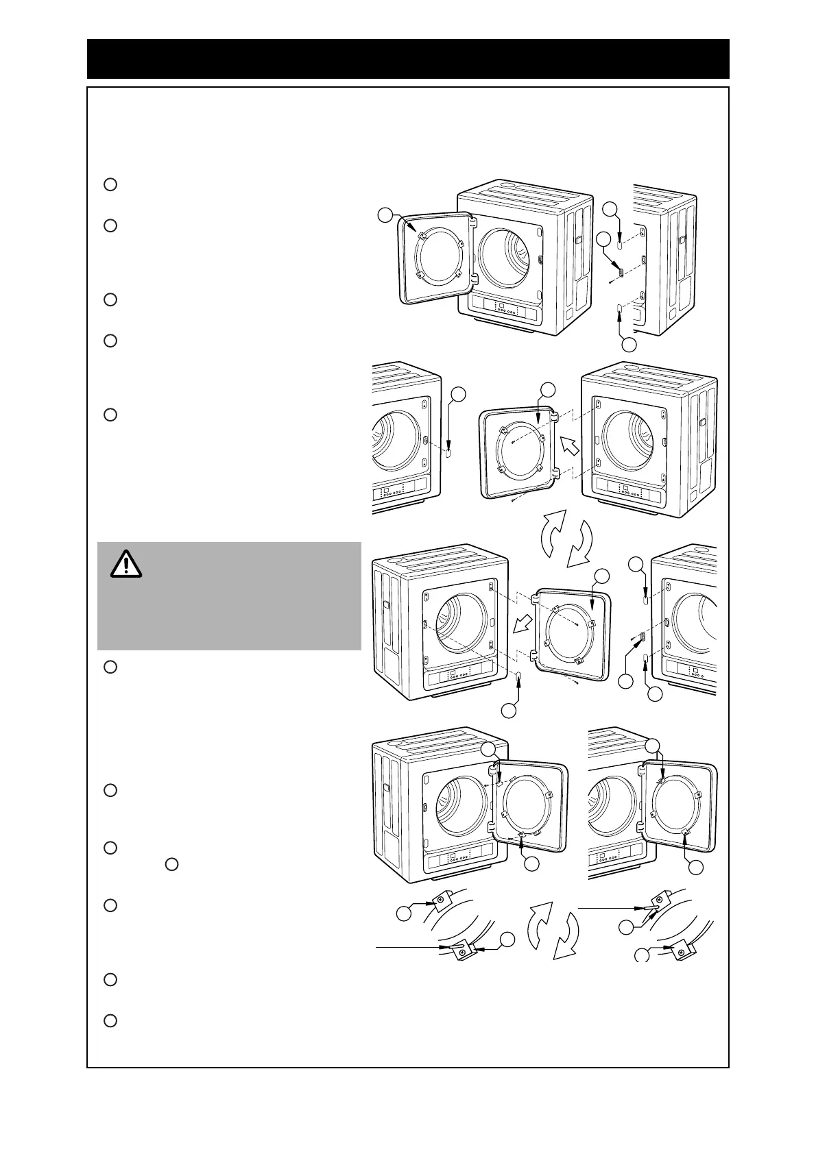 The dryer access door may be swapped from a left handed opening as supplied from the factory to a