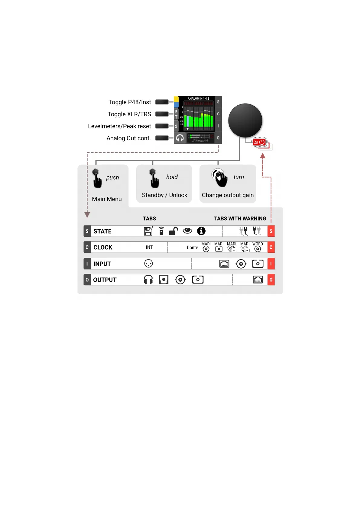• OUTPUT for audio output related settings and routing